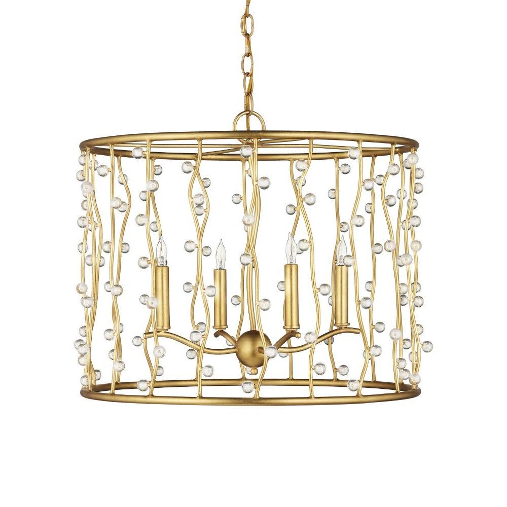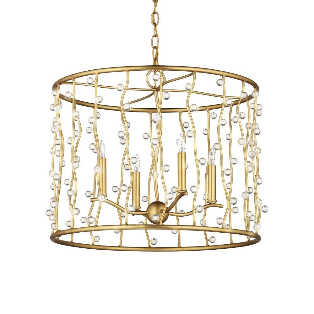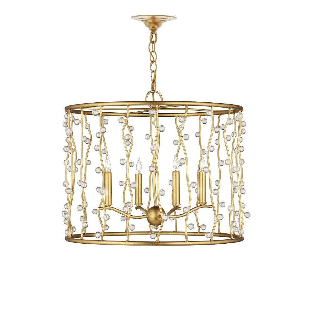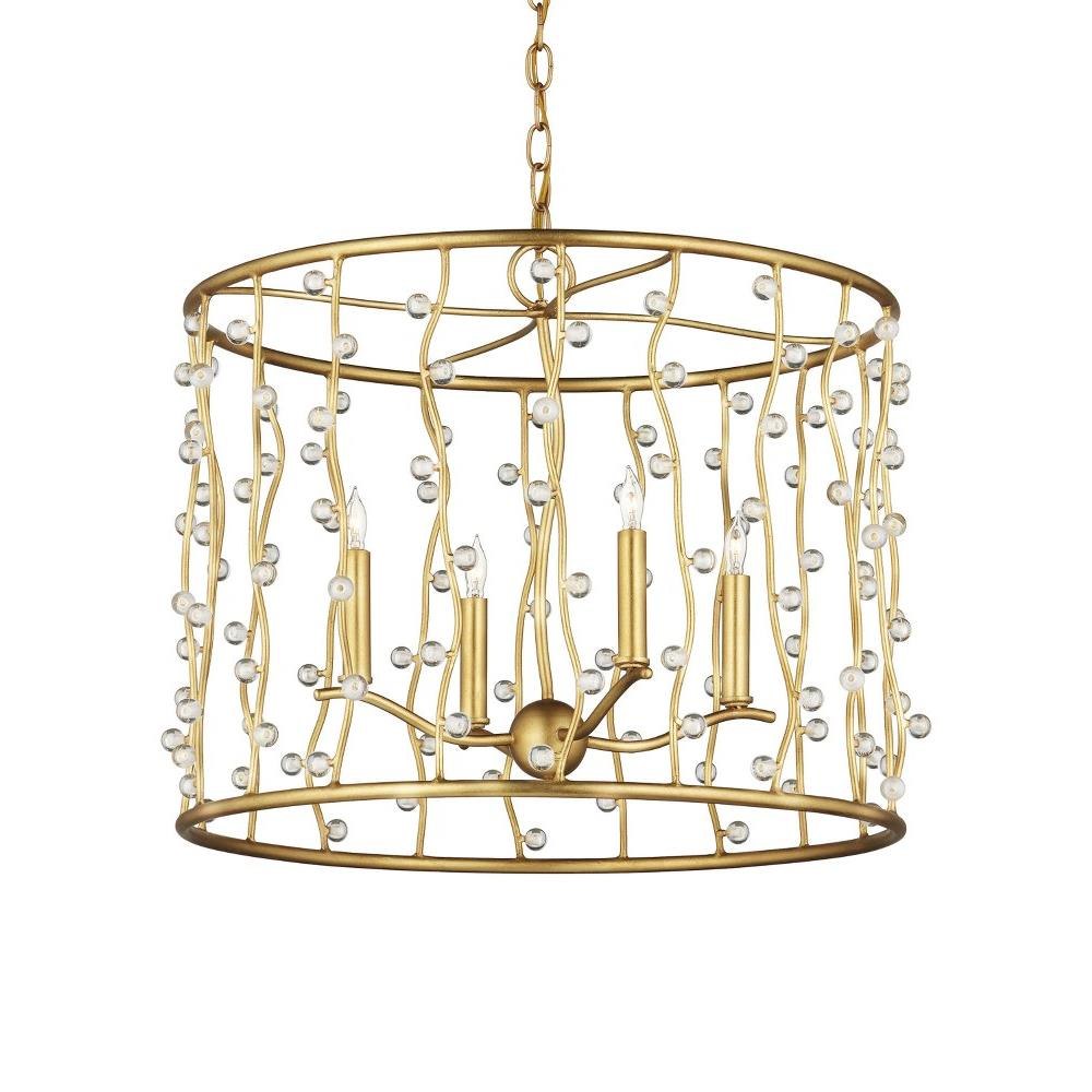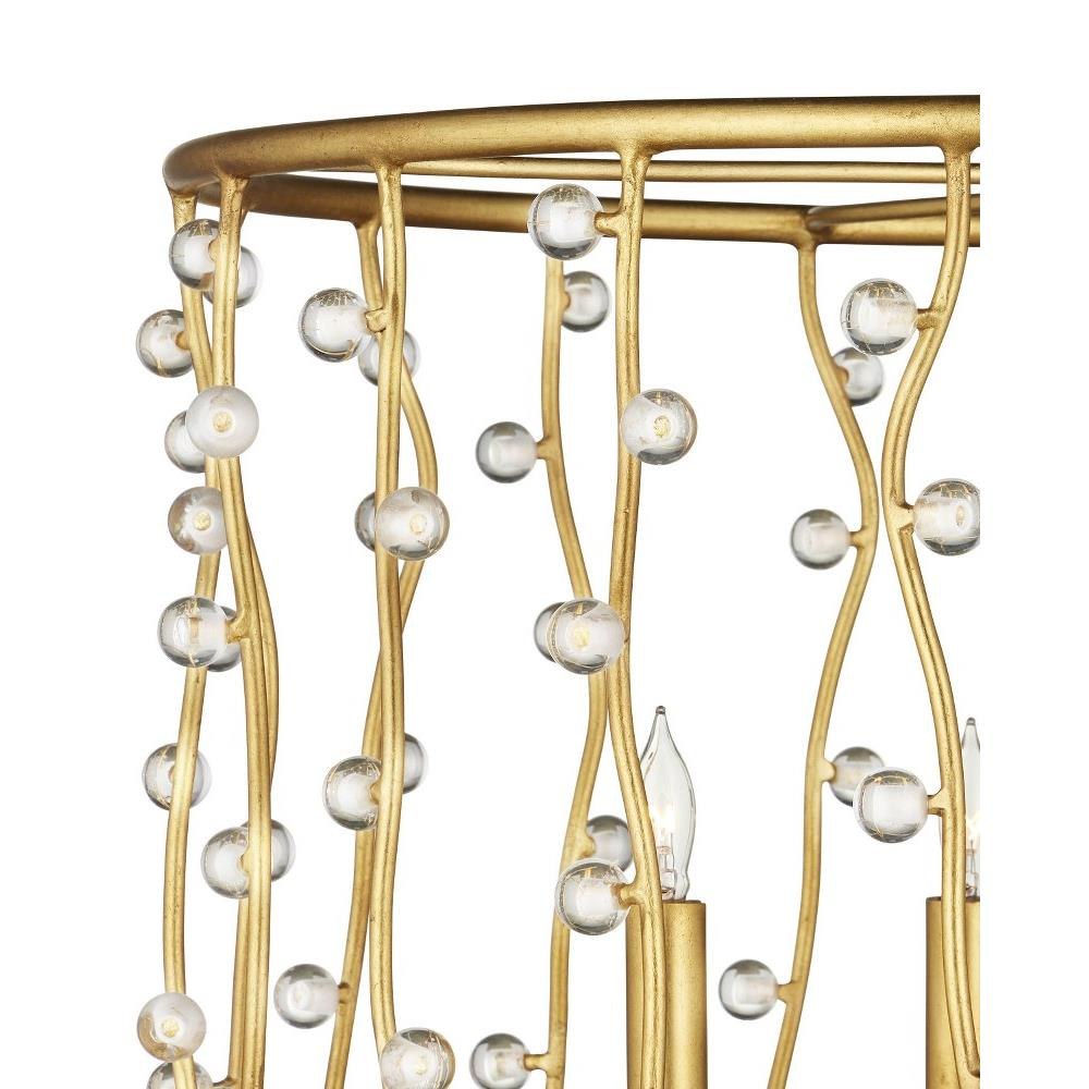 The Adagio Chandelier is a gold chandelier that adroitly holds its crystal beads, which are affixed to wavy metal wires that flow between the top and bottom rings on tiny barbs. The pieces of crystal are prone to glow even when the lights are not switched on, as is the brilliant contemporary gold leaf finish on the metal. Adjustable from 25.25" to 93.25" with use of included chain/rod kit/cable. If your space calls for a longer drop, additional chain/rods/cable is available for purchase.