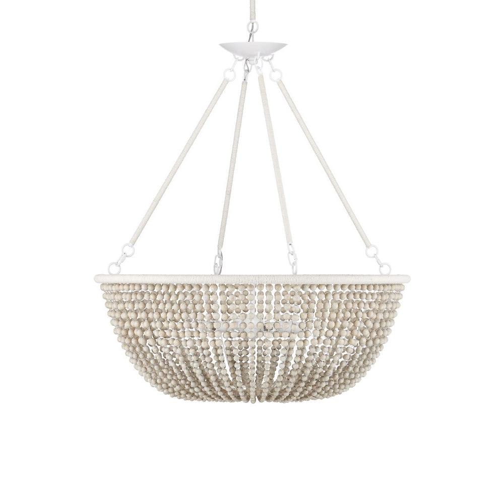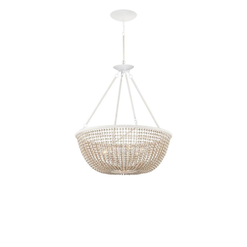 The Wychwood Chandelier is a classic shape that holds swags of wooden beads between its top and bottom rings. Several materials and finishes are in play on this design -- the sugar white finish on the wrought iron, the sandstone finish on the beads, and the Kraft paper twine wrapped around the rings themselves. Adjustable from 42.25" to 123" with use of included chain/rod kit/cable. If your space calls for a longer drop, additional chain/rods/cable is available for purchase.