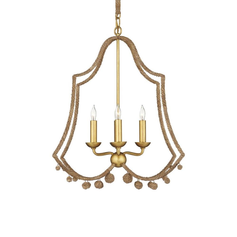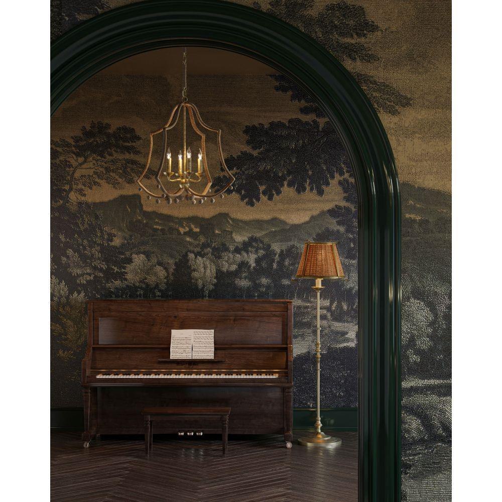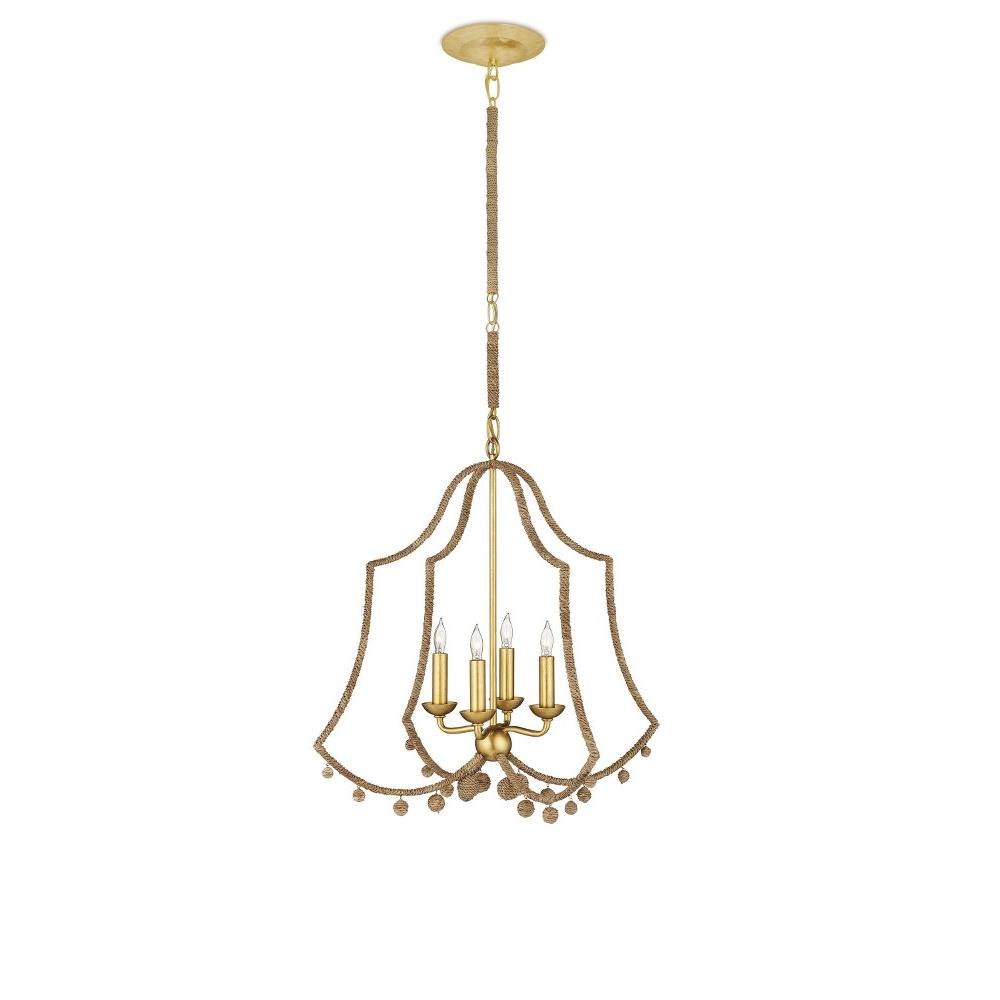 New in the Suzanne Duin Collection, the Nimes Chandelier is infused with the inimitable French flair she is known for. Both the double-bell shape and the ornamental balls that dangle from the bottom of the scallops express the quintessential charm for which the South of France is renowned. The frame, made of wrought iron in a contemporary gold leaf finish, is partially wrapped in natural Lampakanay rope, as are the tiny globes that hang beneath it. Adjustable from 27.5" to 76.5" with use of included chain/rod kit/cable. If your space calls for a longer drop, additional chain/rods/cable is available for purchase.