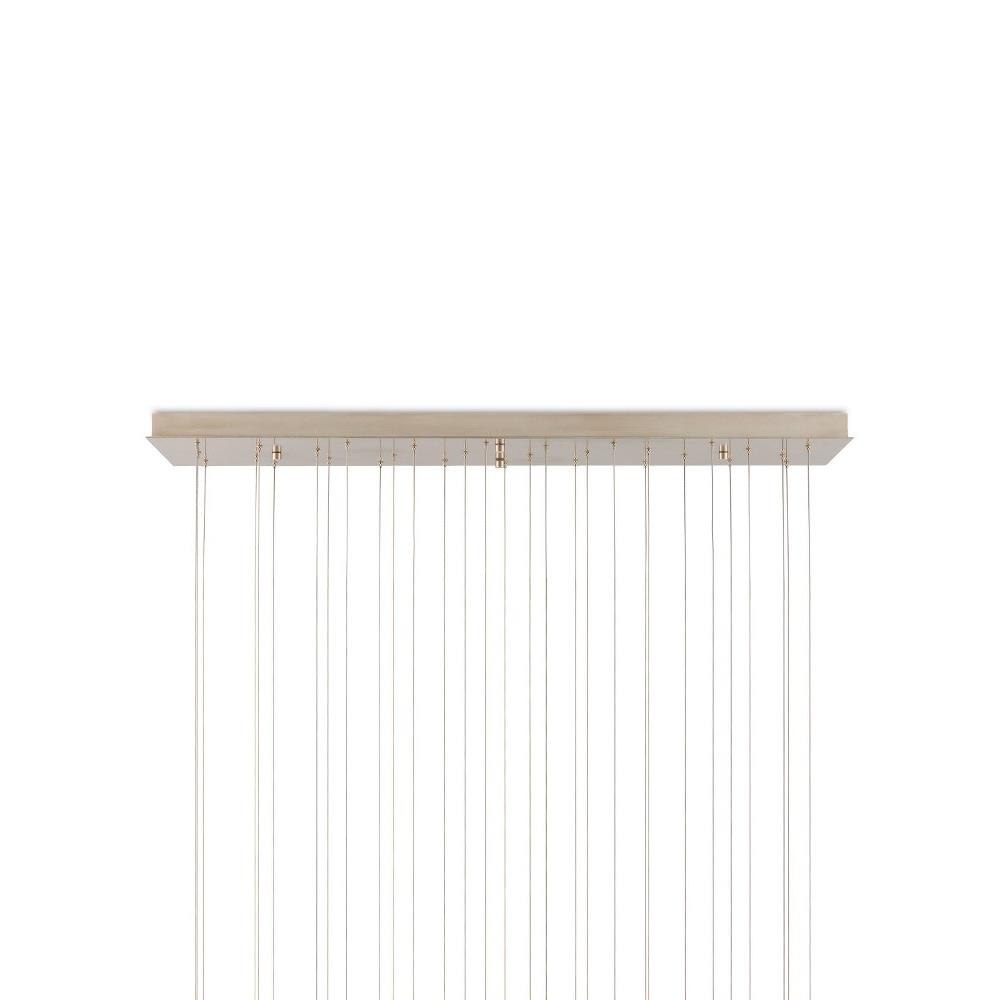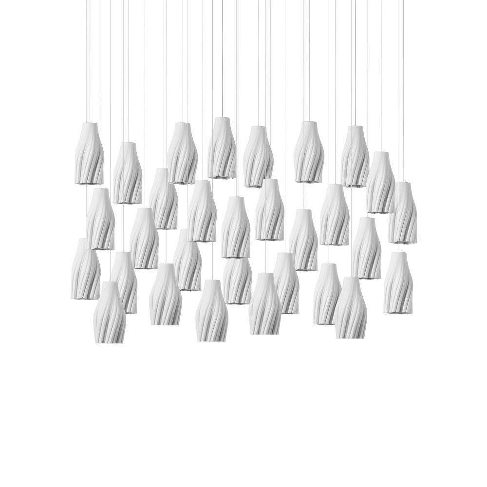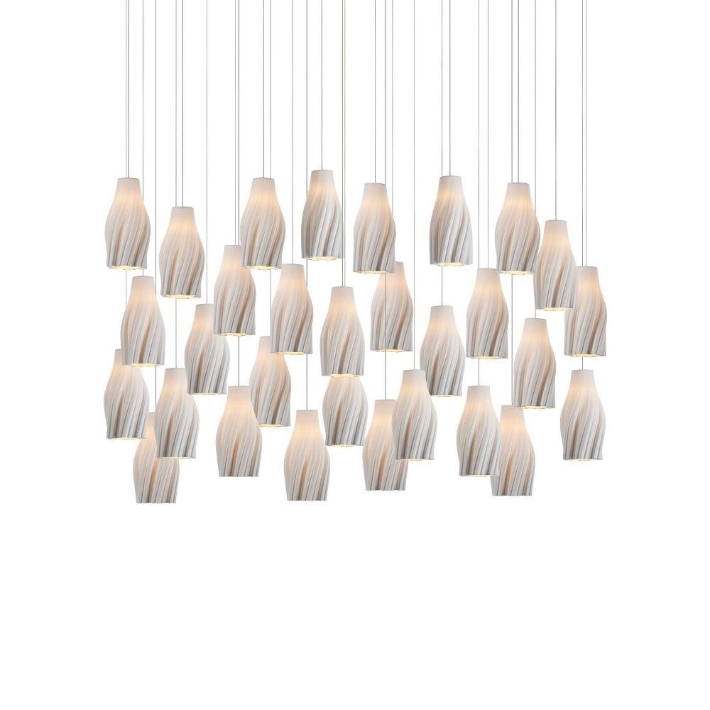 The Posh 30-Light Linear Multi-Drop Pendant has shades made of white ceramic crafted to resemble tassels. The sense of movement created by the material is an artisanal touch that brings the shades a lovely graceful quality. The thin silver cables from which they hangs leave the shades themselves to be the star of the design.