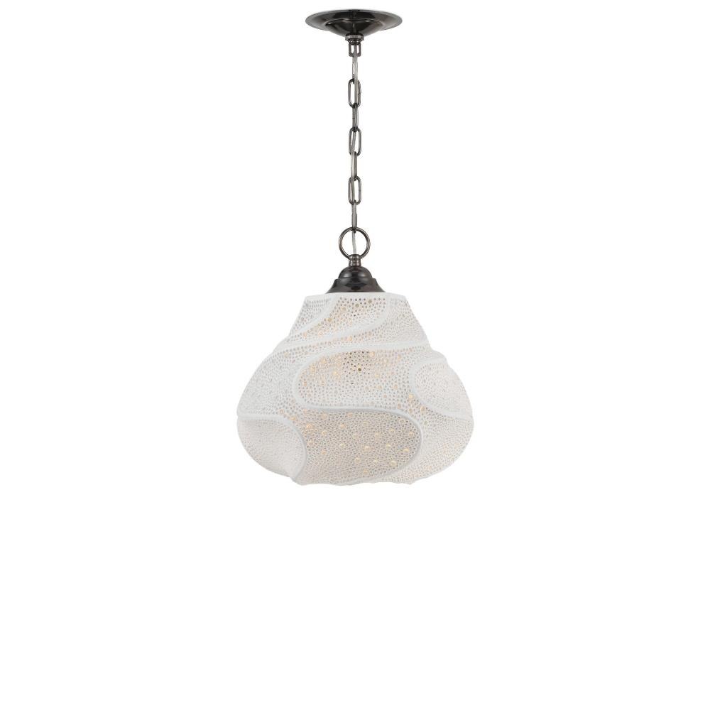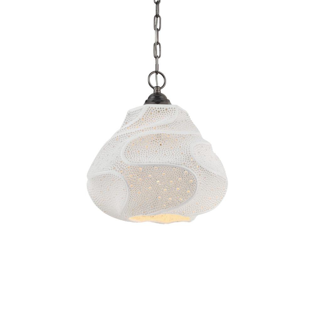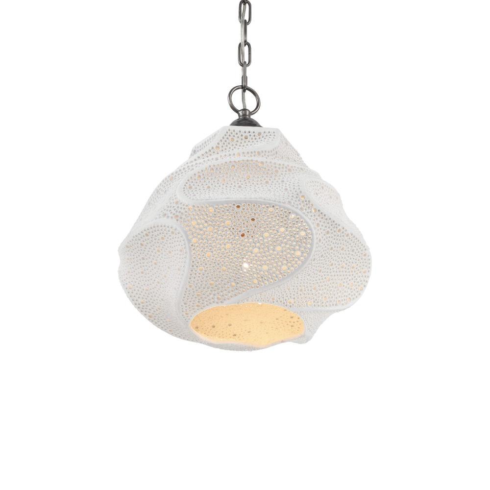 The Wintershall White Pendant features an organically shaped porcelain shade with a flowing, sculptural surface. After firing, each piece is meticulously hand-drilled with two sizes of openings, creating a subtle, rhythmic pattern that requires exceptional precision to execute. This dimmable, single-light pendant showcases the skill of the artisans behind it. Adjustable from 21.75" to 89.75" with use of included chain/rod kit/cable. If your space calls for a longer drop, additional chain/rods/cable is available for purchase.