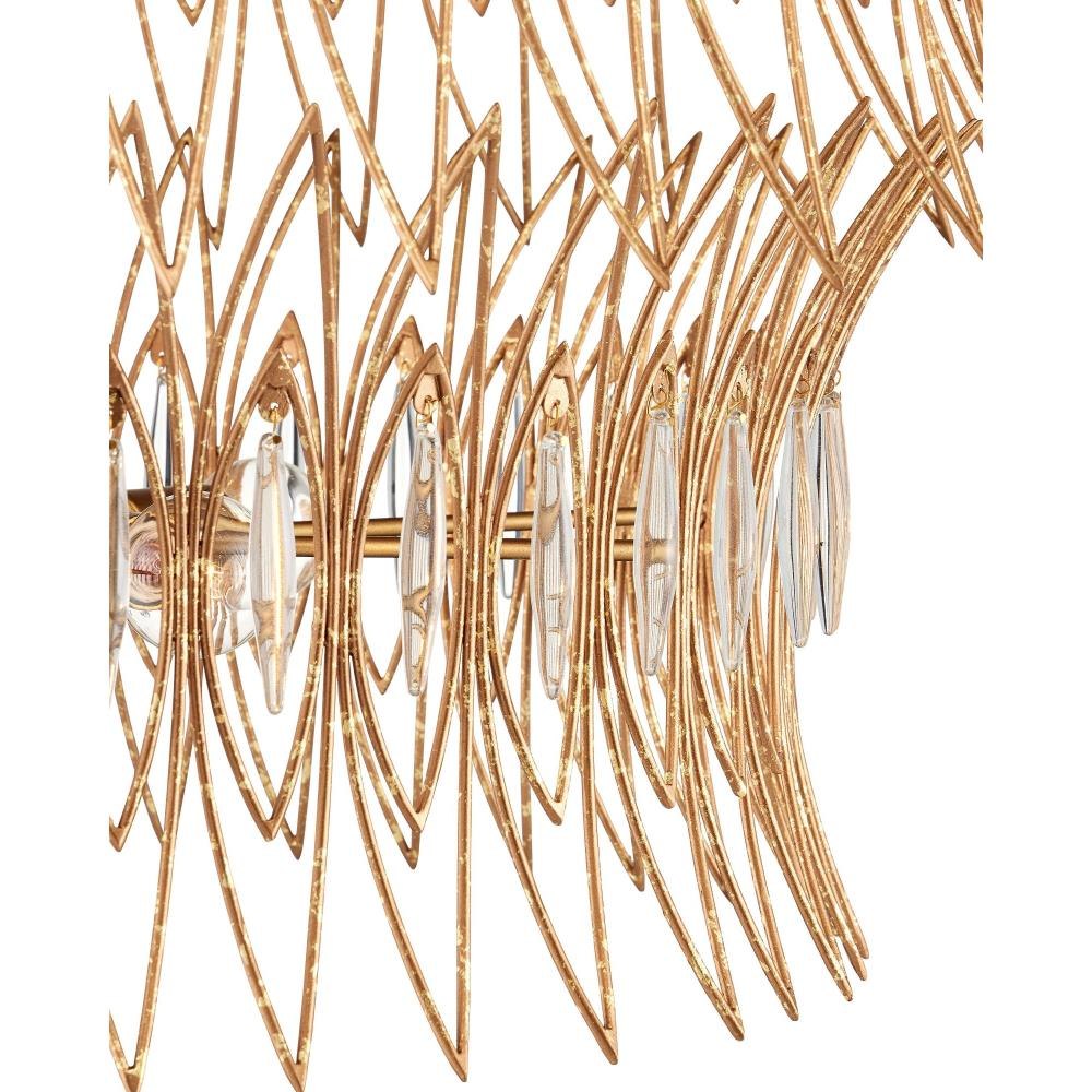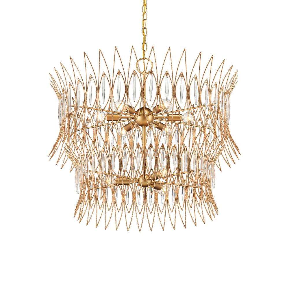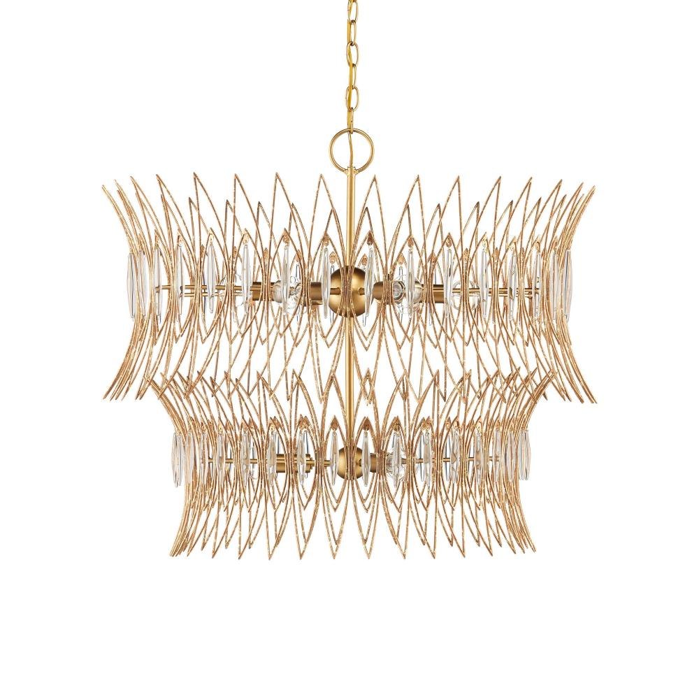 The Marquise Medium Chandelier is crafted from slender wrought iron wires in a Luxor gold finish, giving the surface a subtly speckled texture. Inspired by mid-century jewelry design, the two-tiered crown-like frames hold abstract leaf motifs, each of which is adorned with an oblong piece of clear glass that catches and diffuses the light from the nine bulbs within. This chandelier is dimmable. Adjustable from 31.5" to 99.5" with use of included chain/rod kit/cable. If your space calls for a longer drop, additional chain/rods/cable is available for purchase.