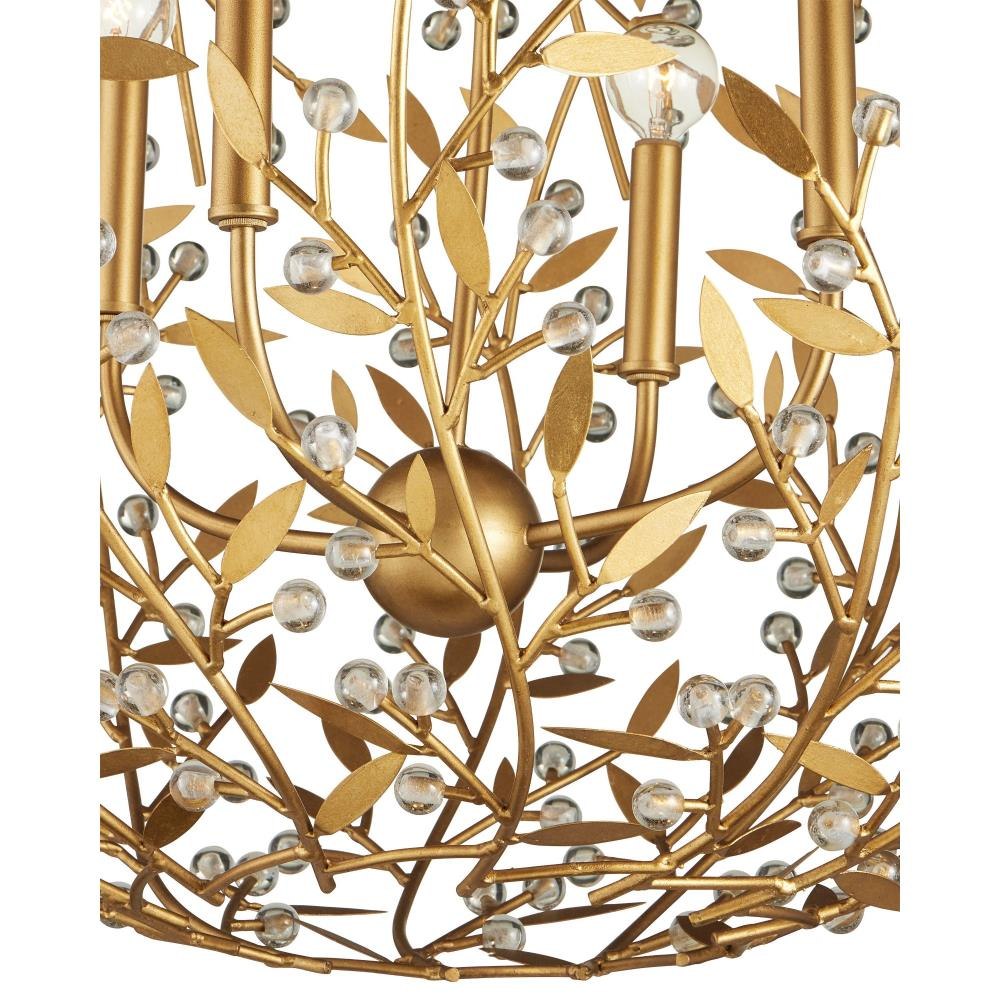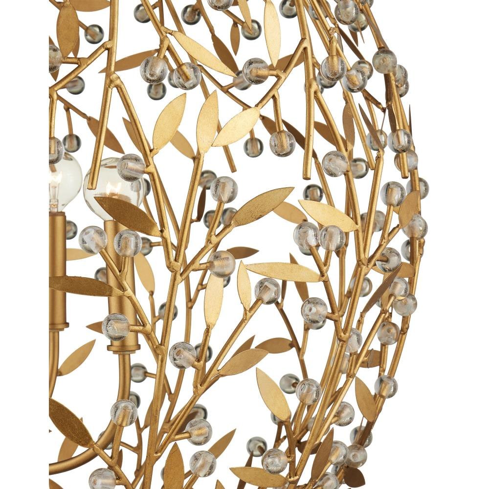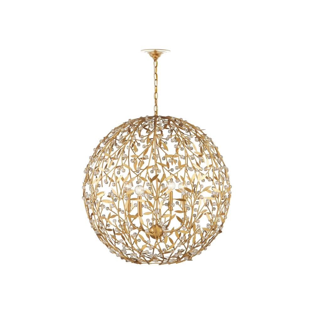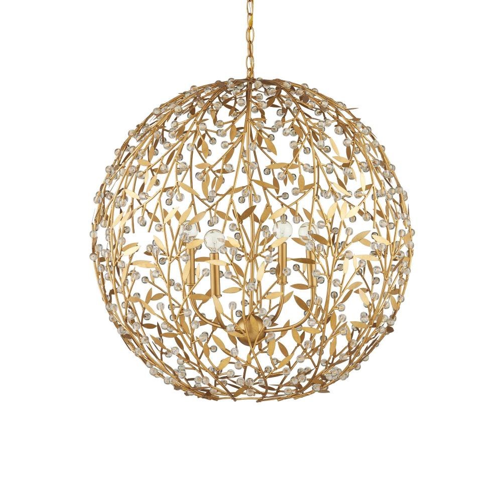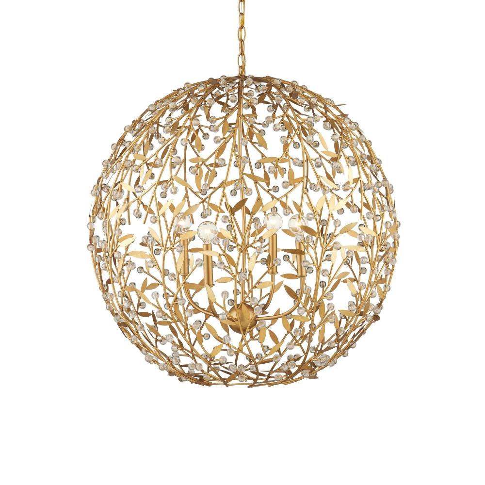 The Secret Garden Gold Orb Chandelier brings a biophilic touch to lighting design with its globe-shaped frame formed from delicate wrought iron stems. Tiny leaves and hand-applied crystal beads are scattered along the structure, catching and reflecting light with subtle sparkle. Finished in a contemporary gold leaf, also applied by hand, the design balances organic detail with refined craftsmanship. Adjustable from 37.5" to 105.5" with use of included chain/rod kit/cable. If your space calls for a longer drop, additional chain/rods/cable is available for purchase.