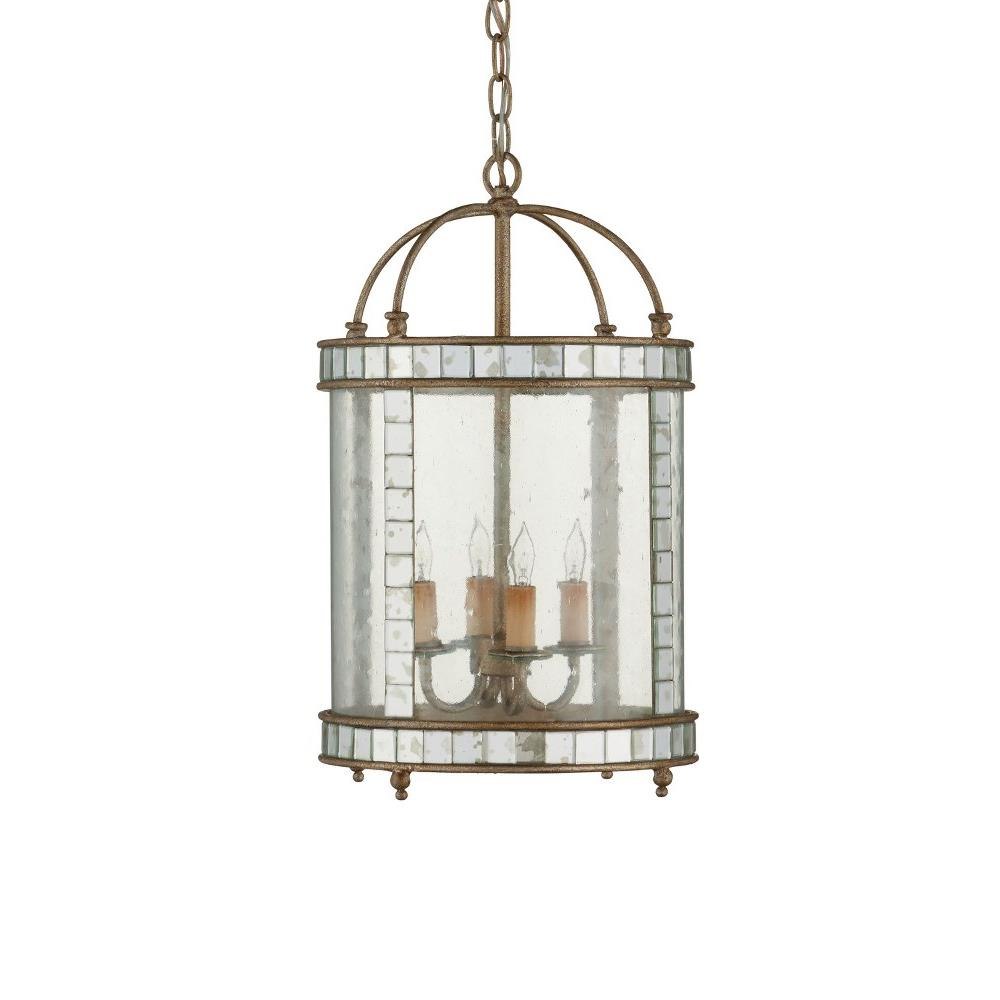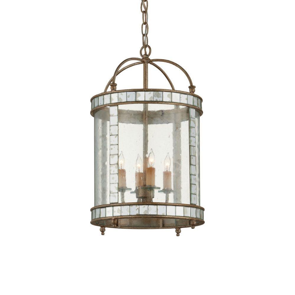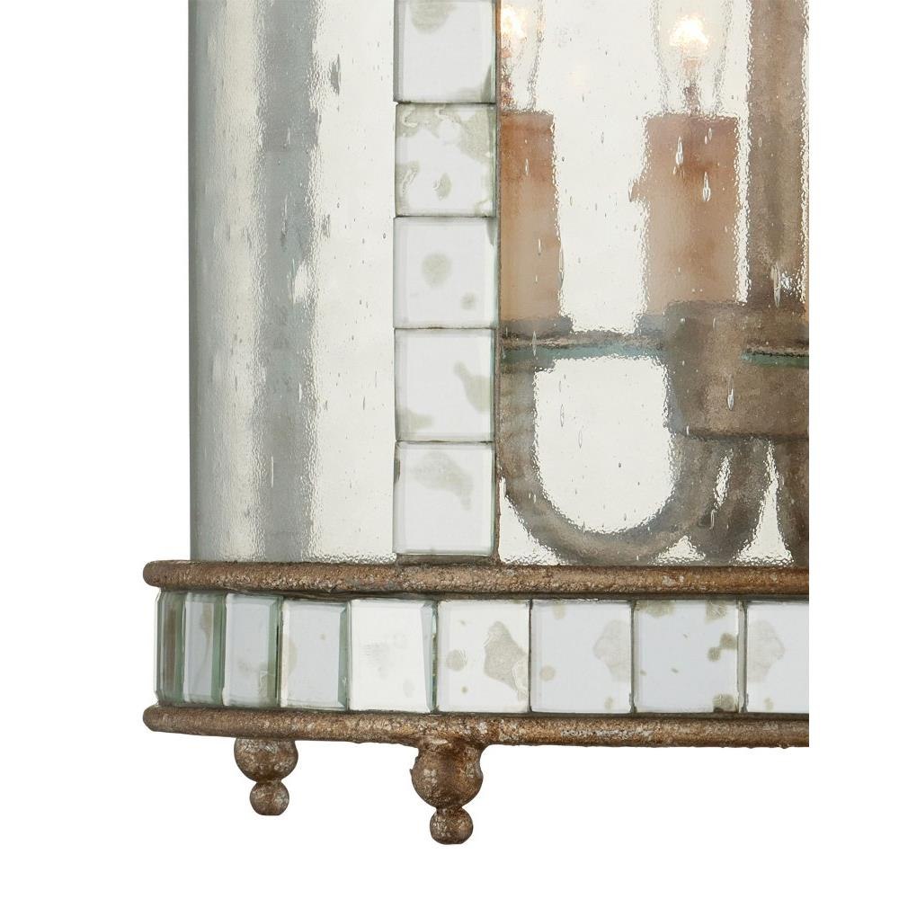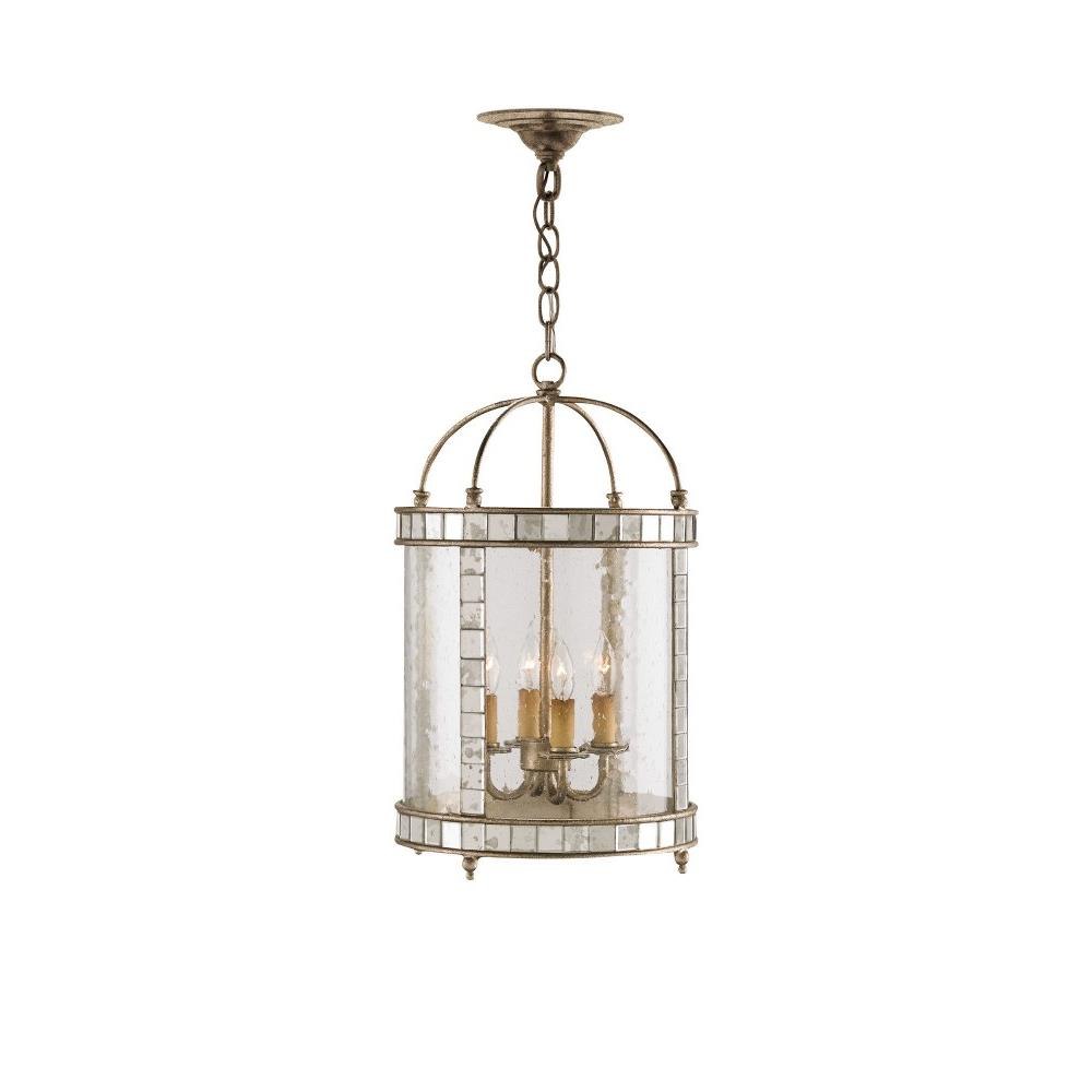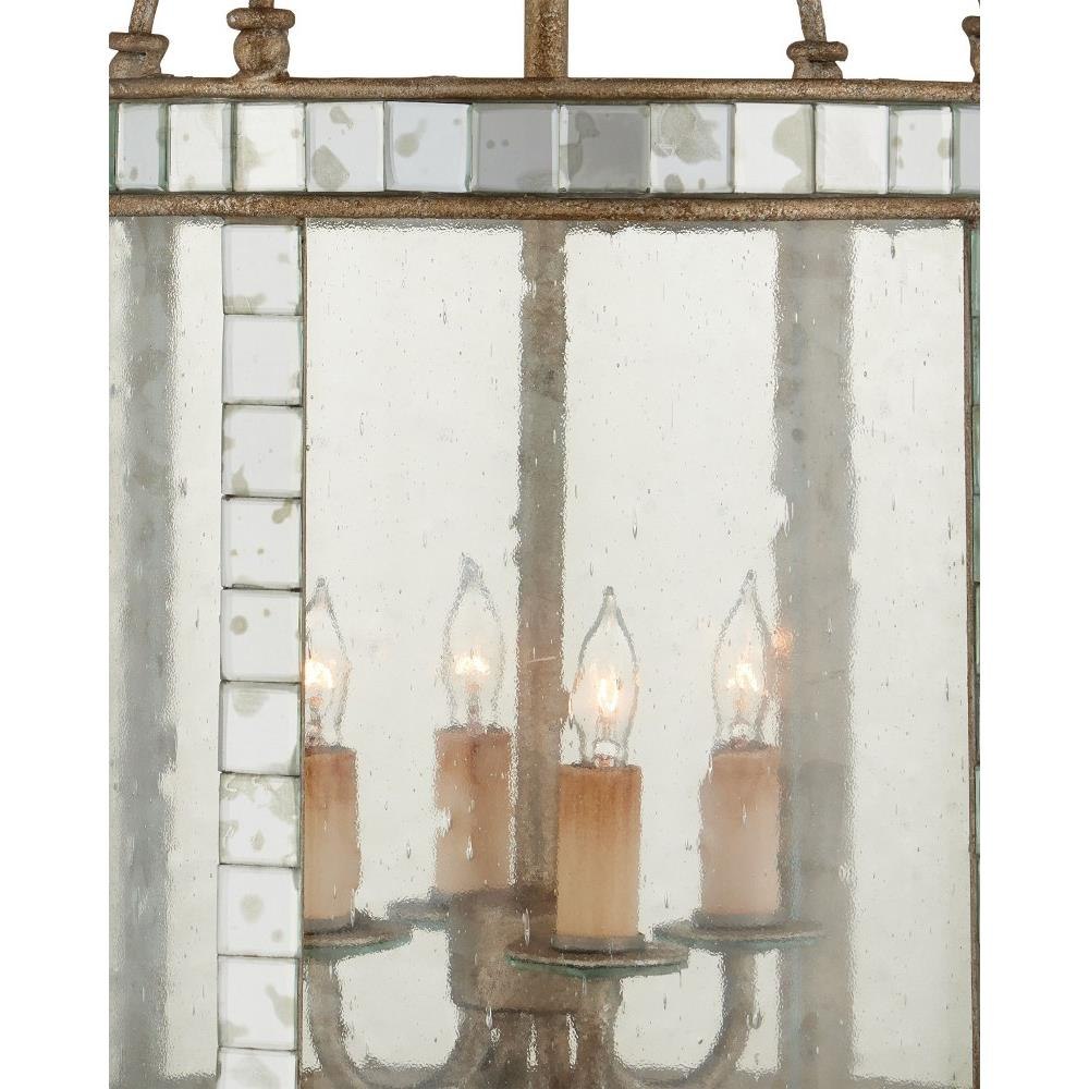 The Corsica Small Lantern has inlaid squares of antiqued mirror covering the frame and an antiqued silver leaf finish on the metal. Adding to the charm of this mirrored lantern are curved seeded glass panels that encase the illumination. We also offer the Corsica in a large lantern and in a wall sconce.