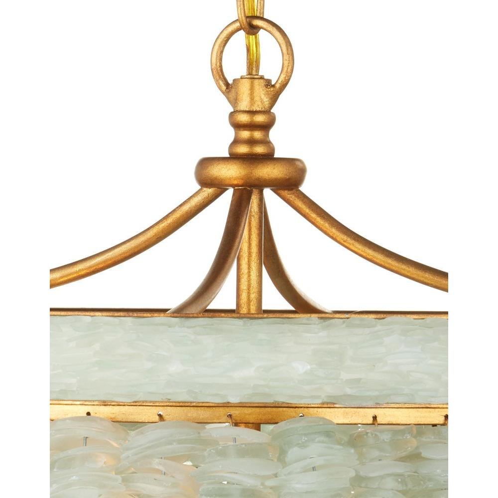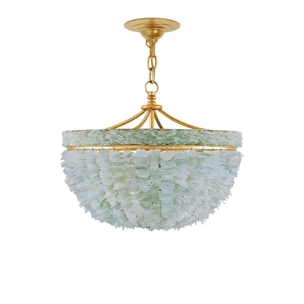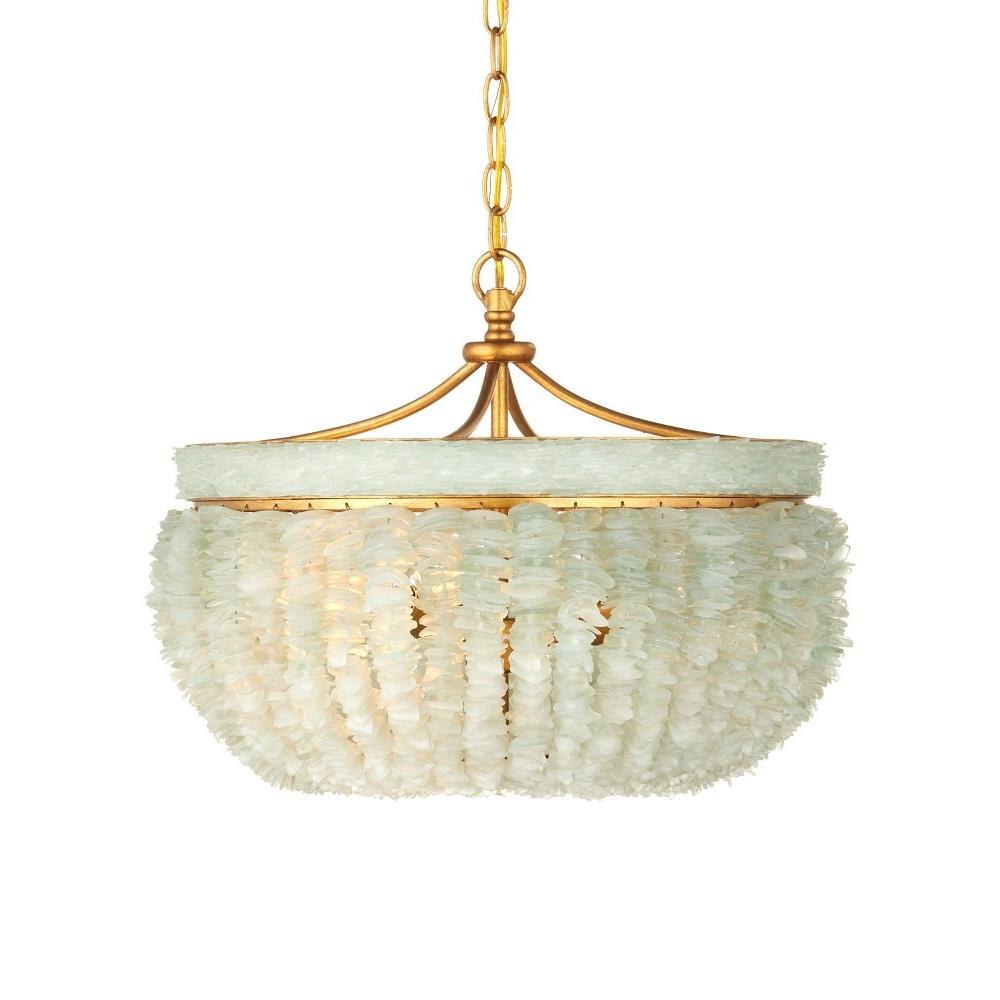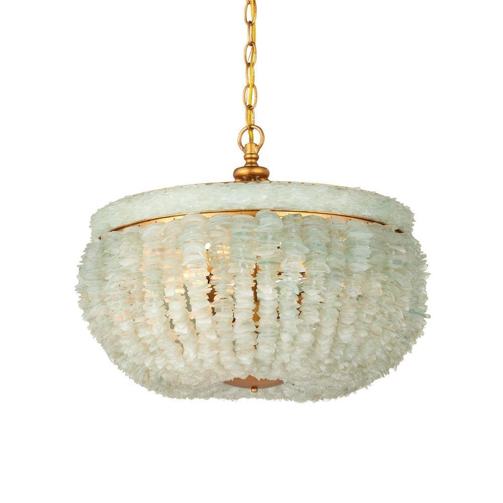 The Bayou Pendant is fitted with a thick layering of tumbled sea-glass in aquamarine and seafoam tones, which will bring hints of the ocean into an interior. The bands that encircle this three-tiered fixture, in a contemporary gold leaf finish, bring the frosted glass pendant a luxurious vibe.