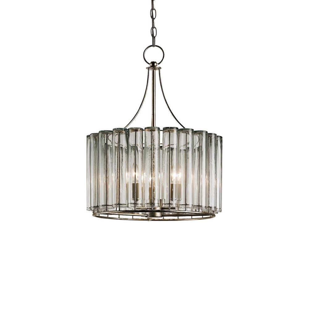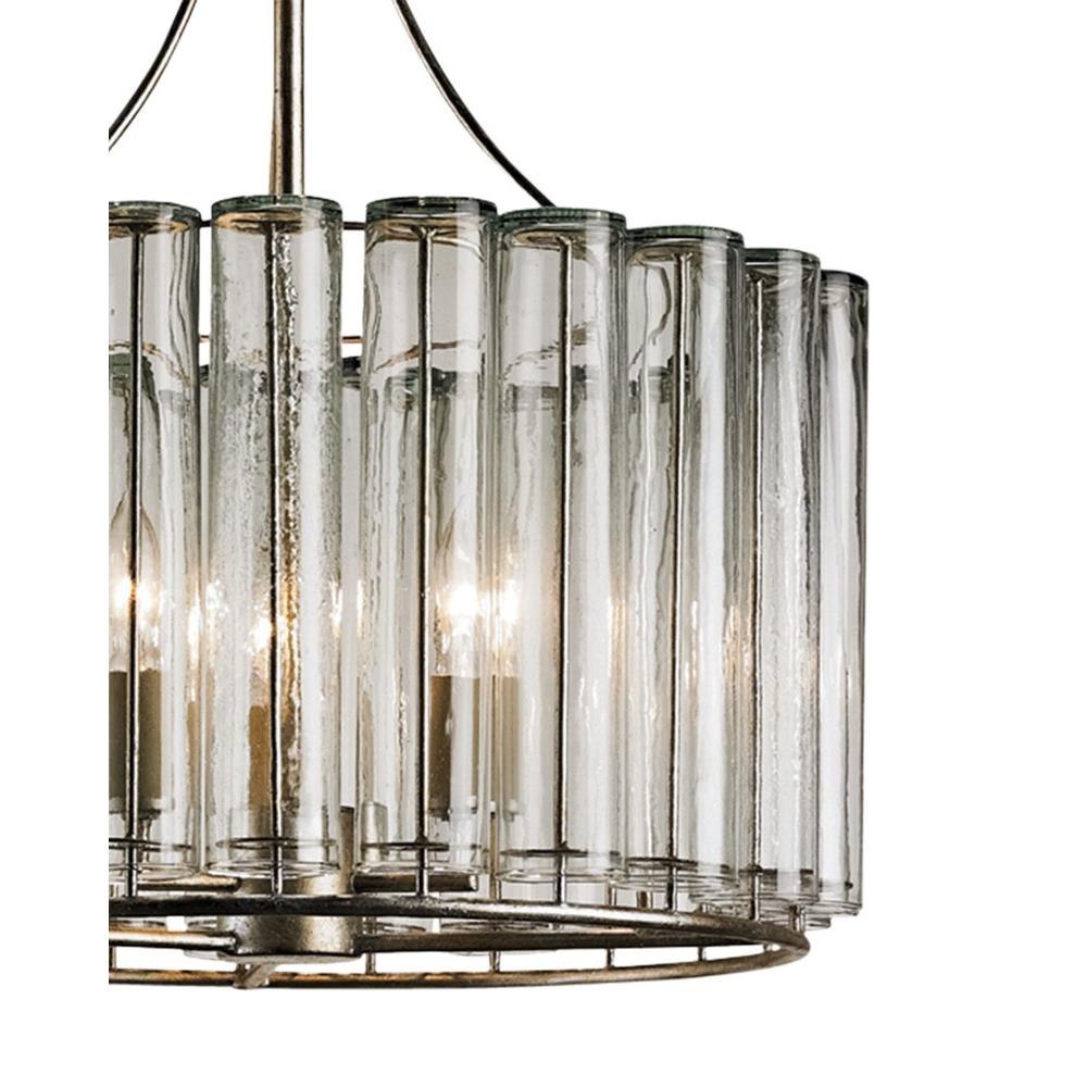 The Bevilacqua Small Chandelier has reflective glass flutes made from recycled bud vases for a shade. Its wrought iron frame is finished in an exquisite silver leaf that compliments the hues in the recycled glass. This silver chandelier is one in a variety of fixtures in the Bevilacqua collection.
