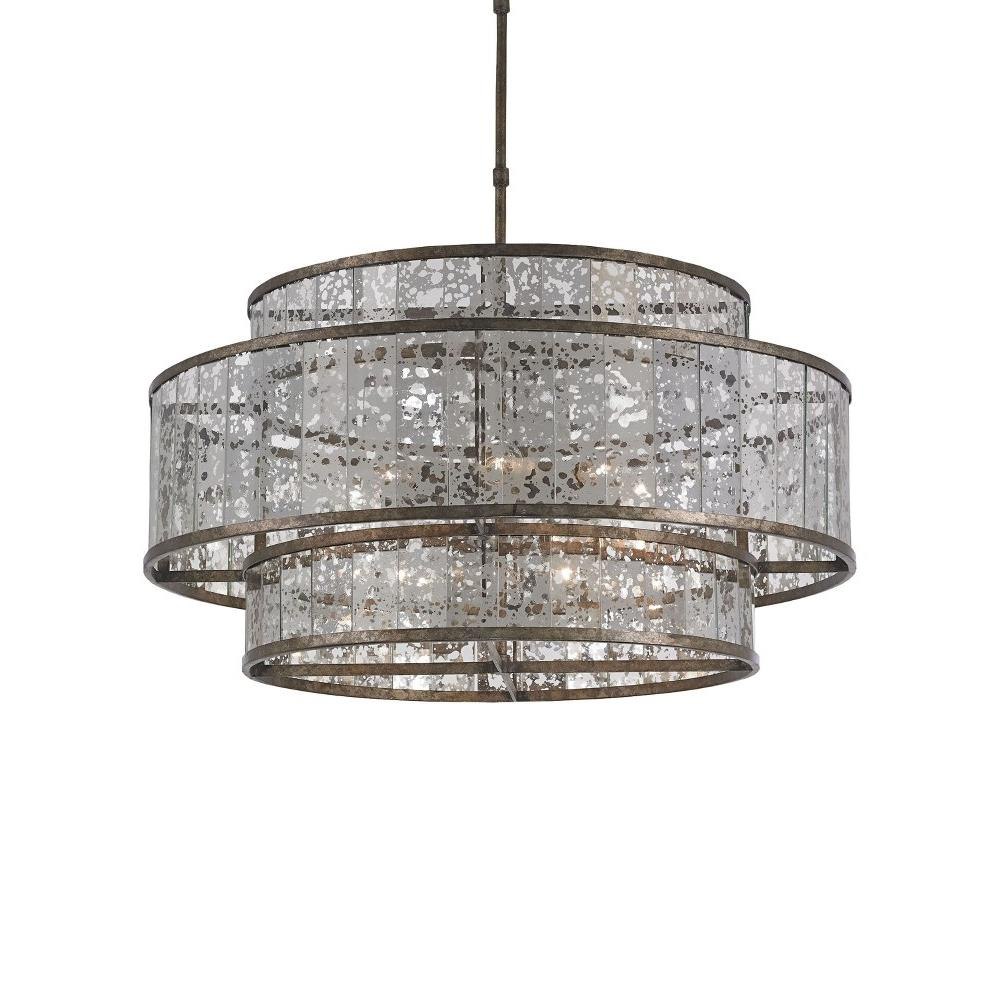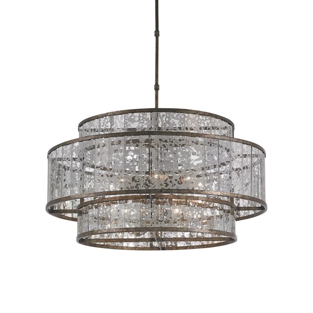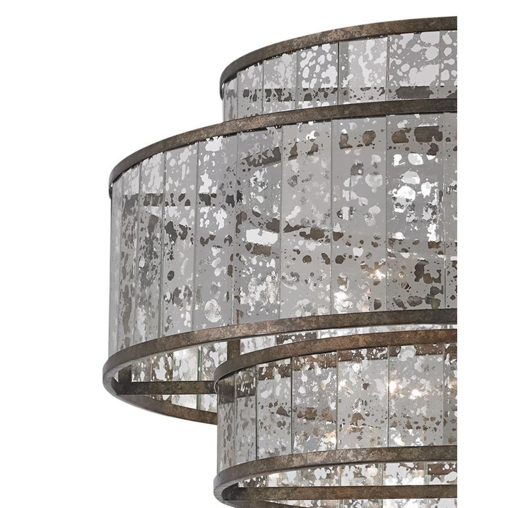 The Fantine Large Chandelier has shades made of Raj mirror that strikingly resemble mercury glass. The Pyrite bronze finish on the metal of this mirrored chandelier echoes the mottled tones in the glass to create synchronicity. The Fantine is also available in a small chandelier and a wall sconce.