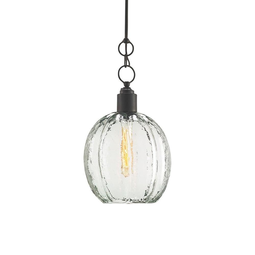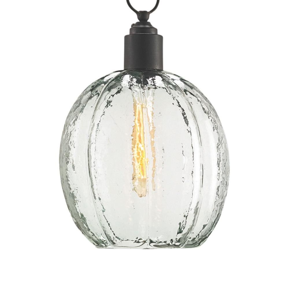 The Aquaterra Pendant with its recycled glass shade has a loveliness not often associated with recast glass. This is because the glassblower achieved a surface that reads like water frozen into a globe shape. An old-iron finish is a contrasting element on the glass pendant, which has an adjustable hanging height.