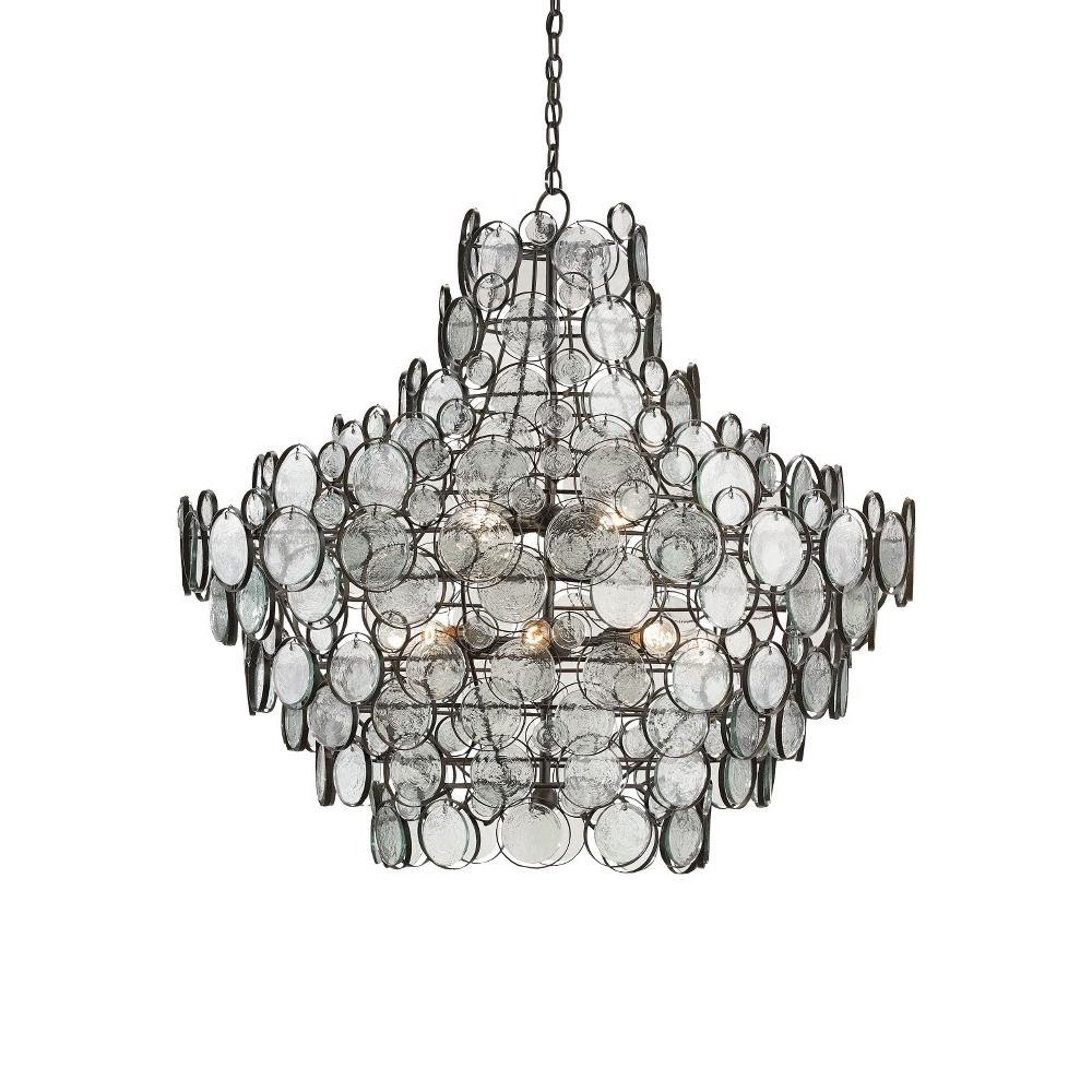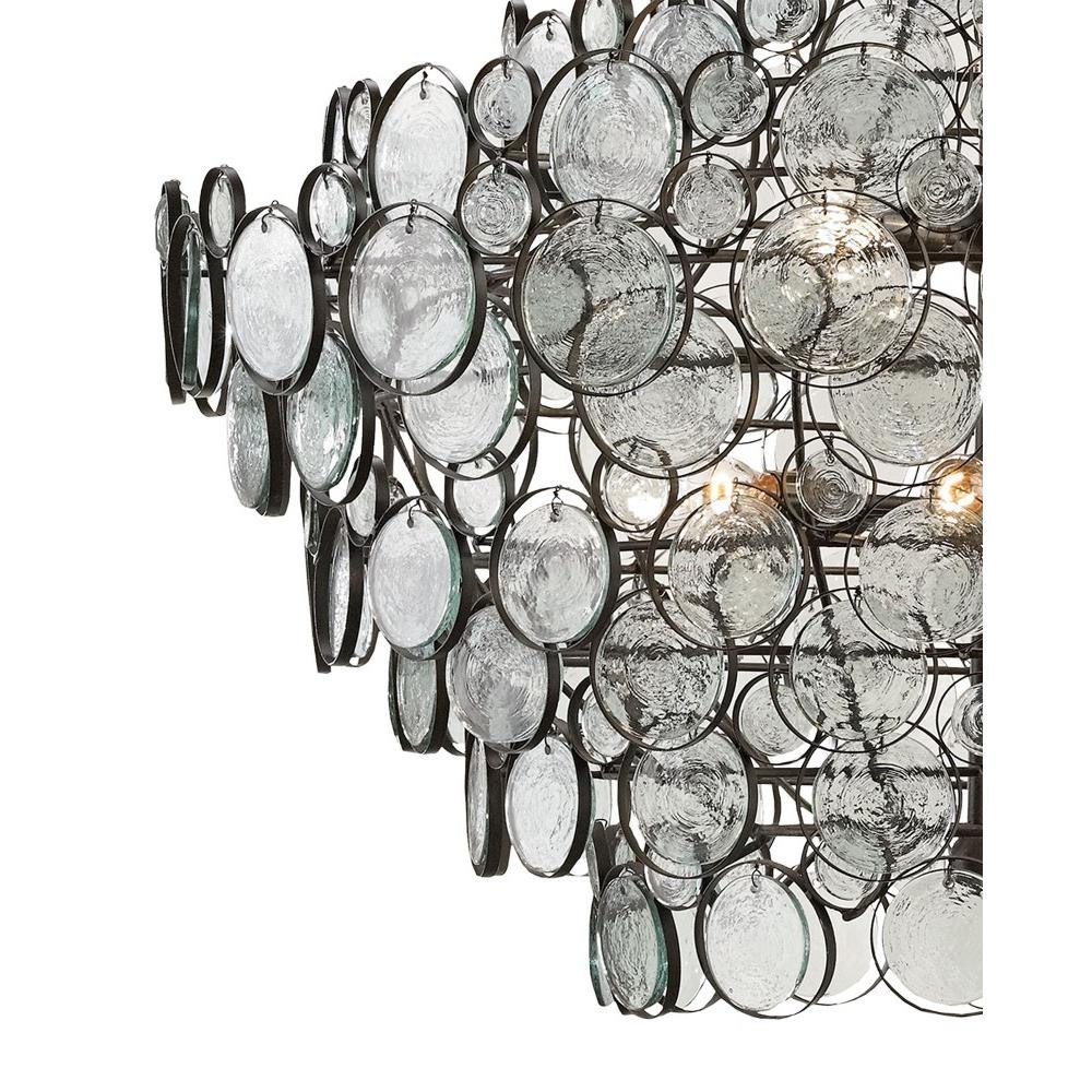 The Galahad Chandelier has recycled glass and recast glass discs that are individually attached by hand to hang from its immense wrought iron frame finished in bronze. The size of this twelve-light glass chandelier is impressive, as are the reflected hues that glint through the recycled discs that make up the shade.