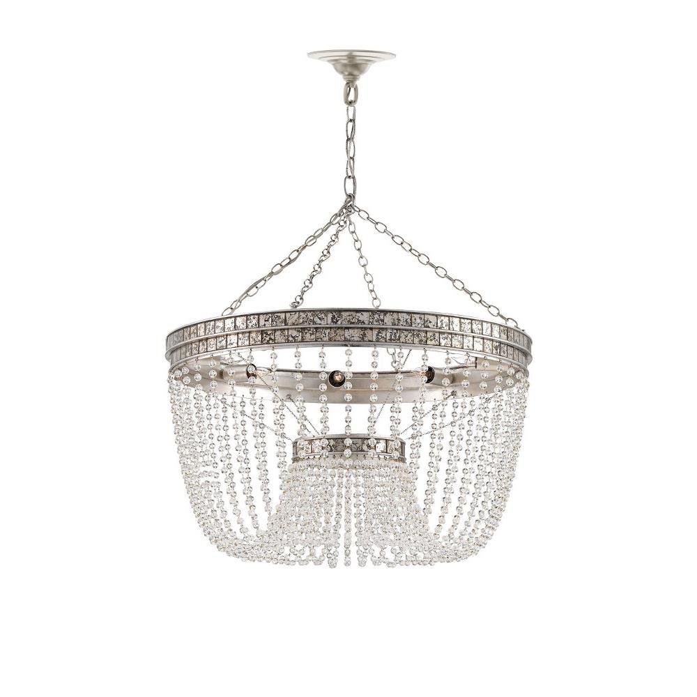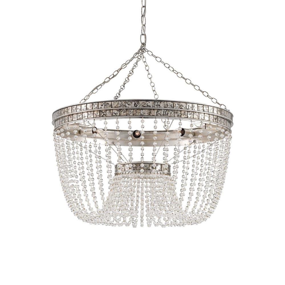Lengths of crystal beads drape gracefully from sparkling bands to bring the classic shape of the Highbrow Chandelier a modern glamour. Accented with hand-applied squares of antiqued mirror, the wrought iron in a distressed silver leaf finish proves how a mundane material can be made luminous.