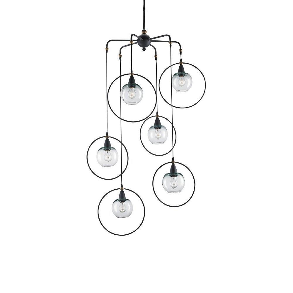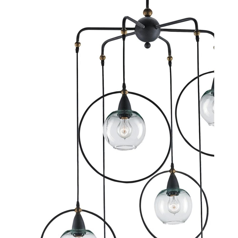 The Moorsgate Multi Pendant embodies mid-century modern style with its asymmetrical cascade. The circles of wrought iron surrounding the glass globes in a Blacksmith finish make this black pendant a lively contrast of materials. We also offer the Moorsgate in a pendant and a trio pendant.
