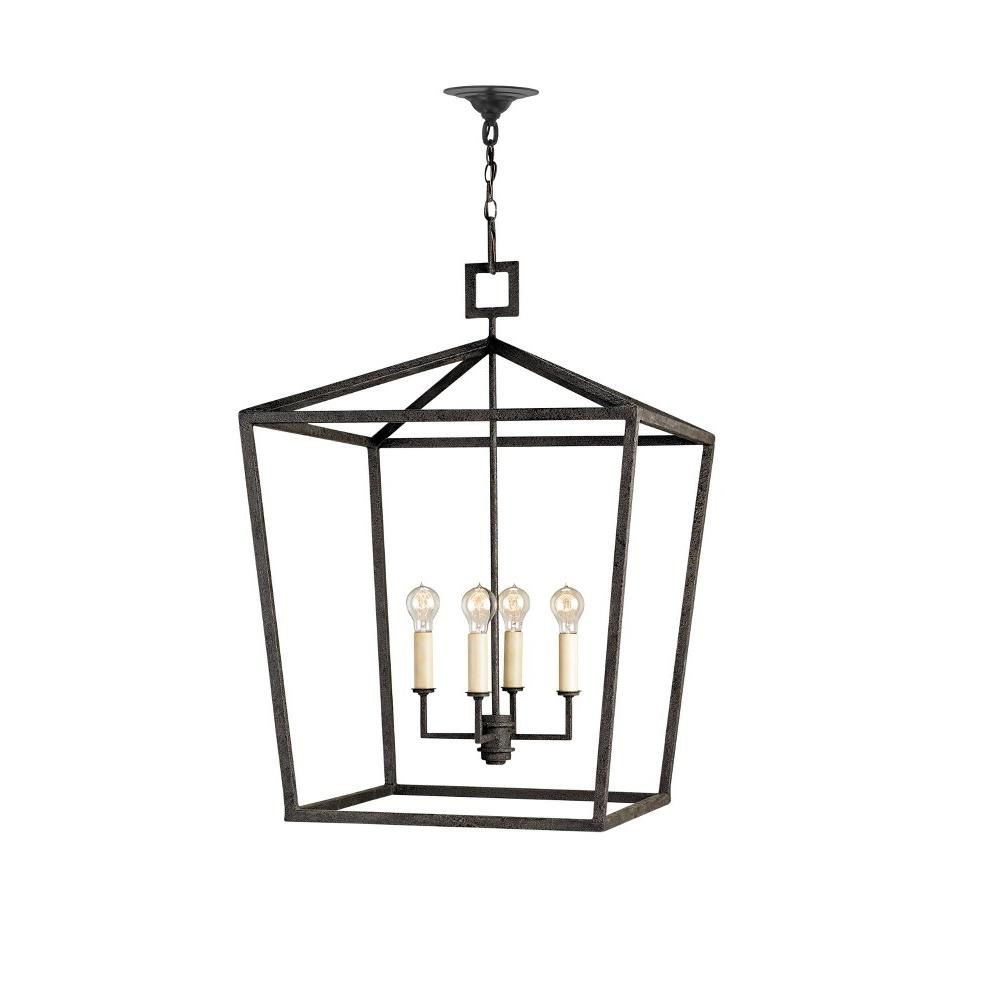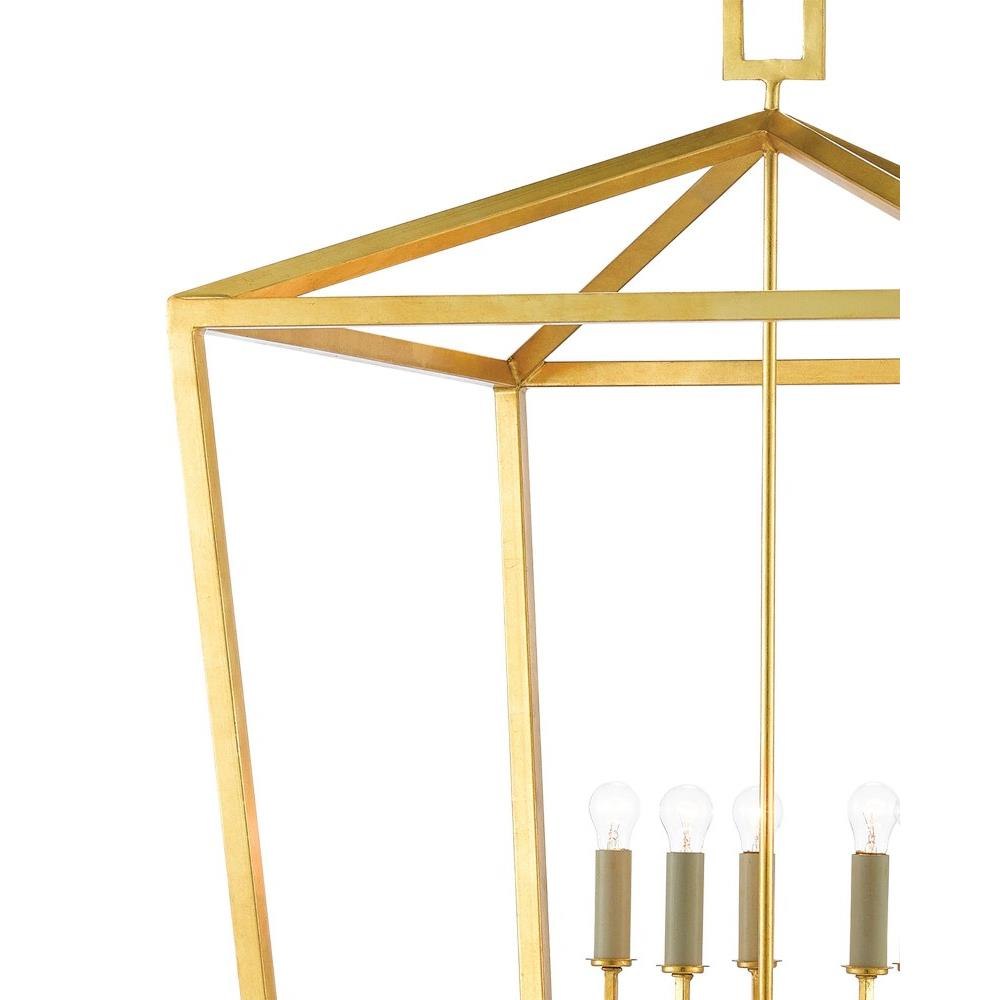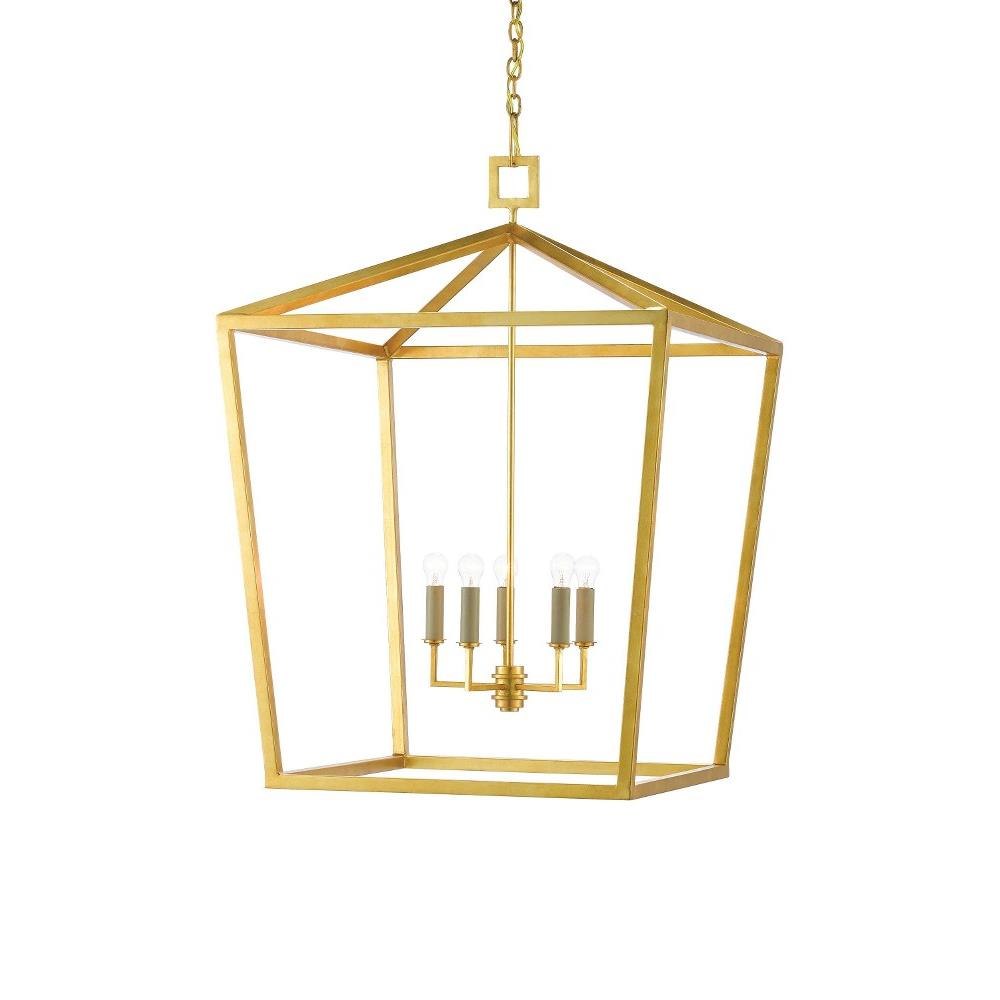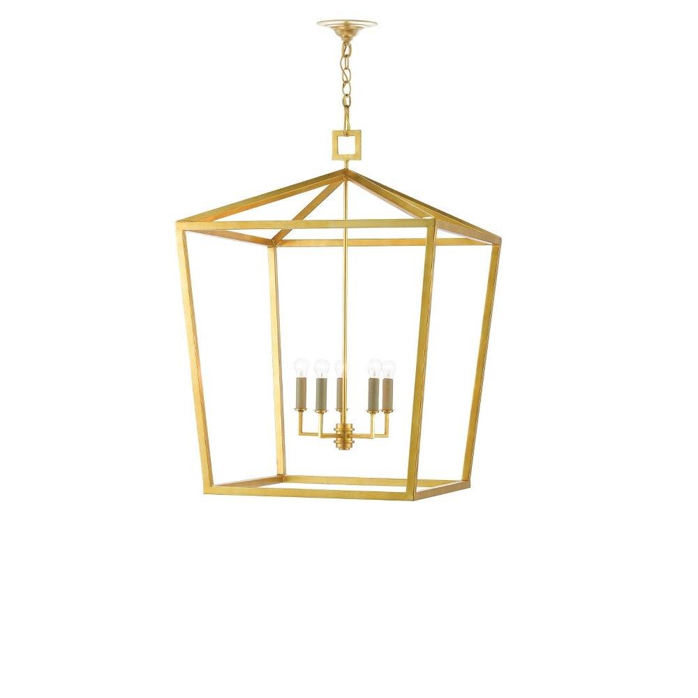 The Denison Gold Grande Lantern is a hammered wrought-iron fixture in a contemporary gold leaf finish. The classic lantern shape has stood the test of time to make it one of our most popular offerings. A design element of note is the square that fastens the lantern to the chain. This large-scale gold lantern is one of a number of sizes and finishes in the Denison family.
