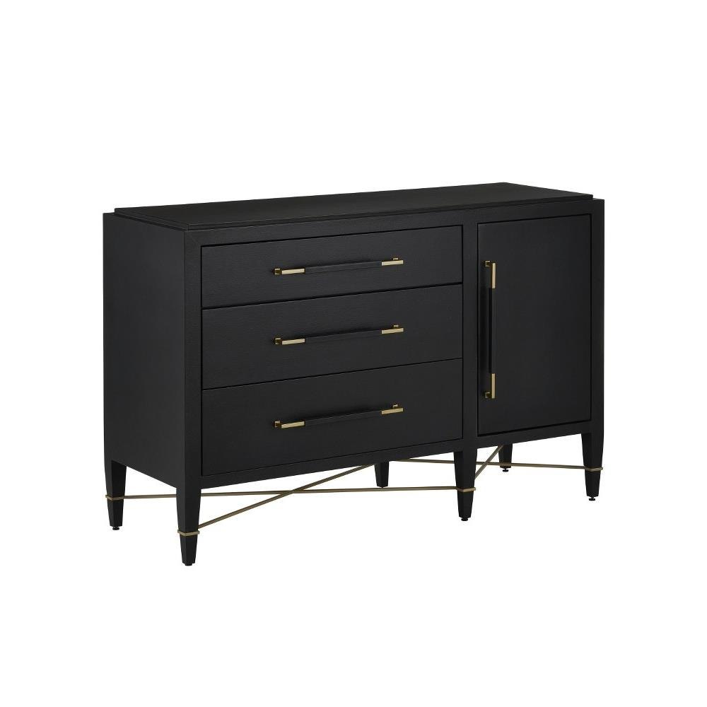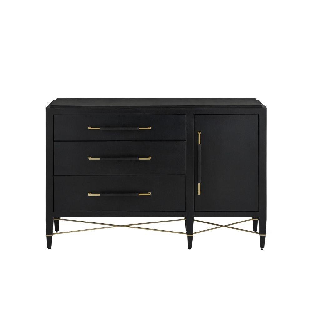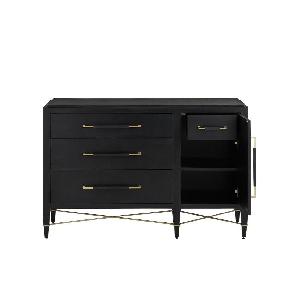 The Verona Black Three-Drawer Chest is darkly handsome covered in black lacquered linen with metal detailing in a champagne finish. The stretchers on this black chest create added interest to enhance its flair. The beautifully detailed drawer pulls, which are wrapped in matching material in the middle and left bare on each end, grace each drawer with their metallic sheen. This is a sophisticated touch, as are the squared edges of the hardware that match the straight-edges on the stretchers. The door with its single pull, which hides a two shelves and a drawer, is an elegant design move. Aimee Kurzner designed the chic Verona family of products.