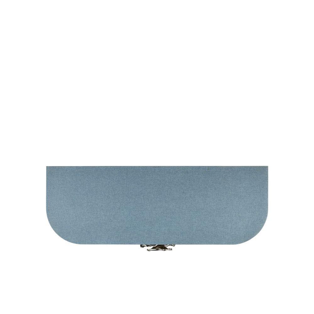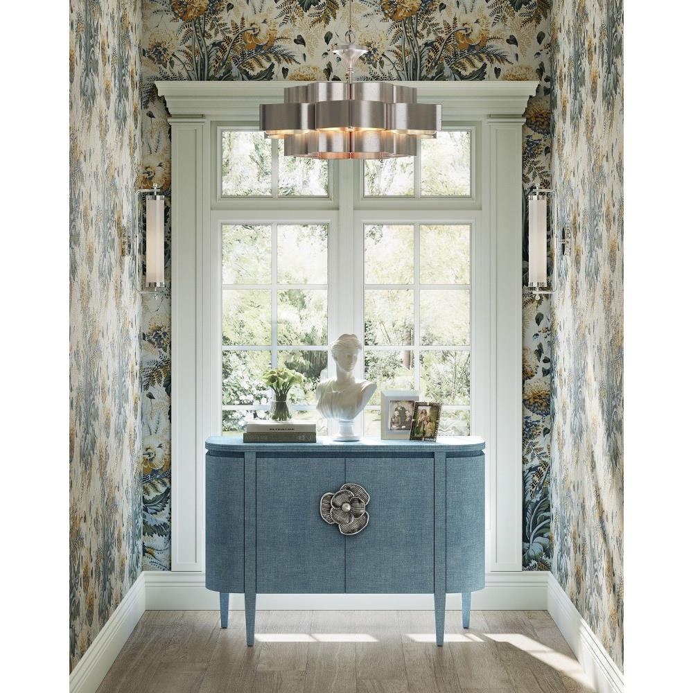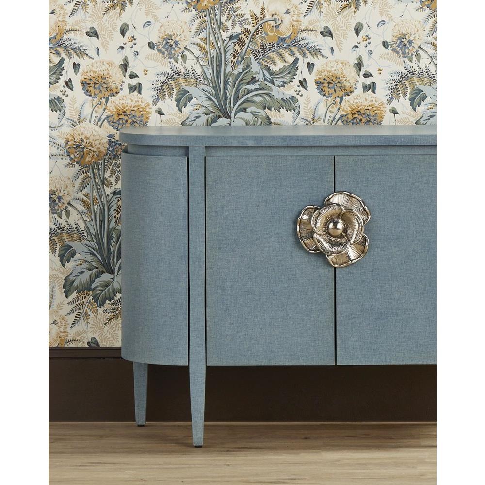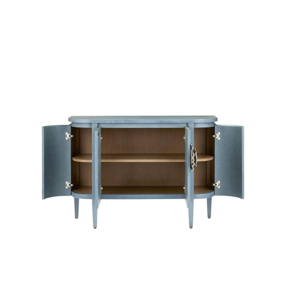 The impressively sized silver flower pull on the Briallen Blue Demi-Lune Cabinet is a stunning ornamentation. A bright accent on the lacquered blue linen surface, the brass floral motif in a polished nickel finish brings the blue cabinet a sophisticated feel and illustrates the skill of our artisans who hand-cast the handle in brass. The four doors on the cabinet open to reveal two fixed shelves and one adjustable shelf.