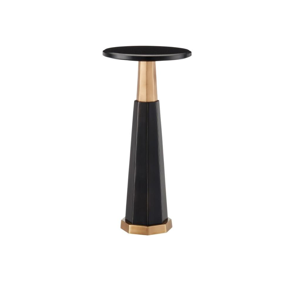 The Gieves Drinks Table is a sophisticated blend of rich materials and timeless design. Its round black granite top with a polished surface rests on a telescoping pedestal crafted from metal. The pedestal showcases a refined mix of antique brass and bronze finishes, creating a subtle interplay of warm metallic tones. Anchoring the design is a fluted base.