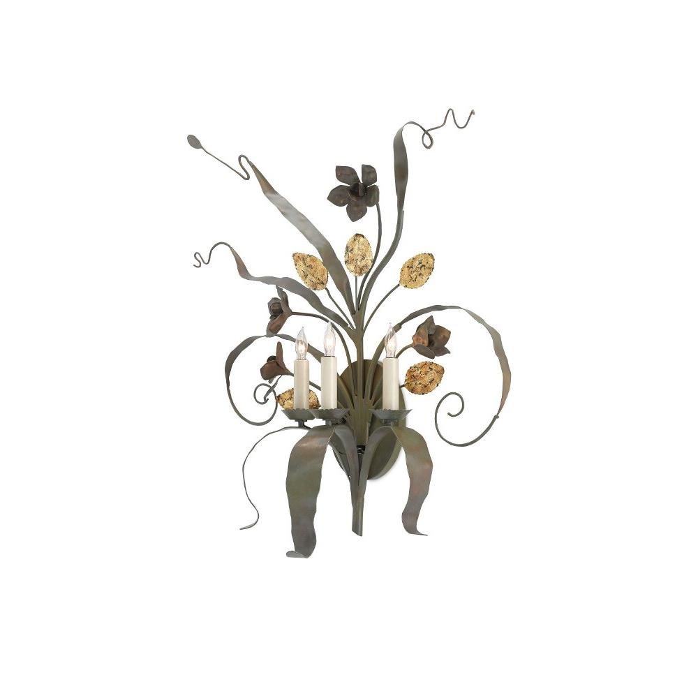 The Westley Wall Sconce has a mix of verdigris and antique gold leaf finishes on its surfaces. The intermingling of tones highlight flourishes, leaves, and flowers that bloom from the wall plate. The gray sconce with its whimsical design is included in our Bunny Williams Collection.