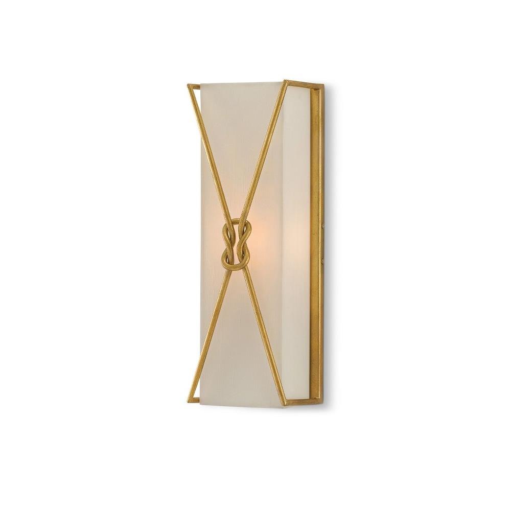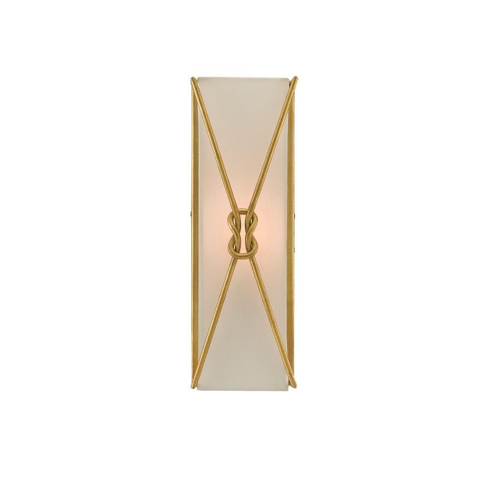 The Ariadne Large Wall Sconce with its looping knots is a cleverly designed rectangular wall light. The body of this sconce is made of wrought iron in a contemporary gold leaf finish; the inset shade that softens the light source is made of off-white shantung. This gold sconce is one of a number of pieces in our Ariadne offerings.