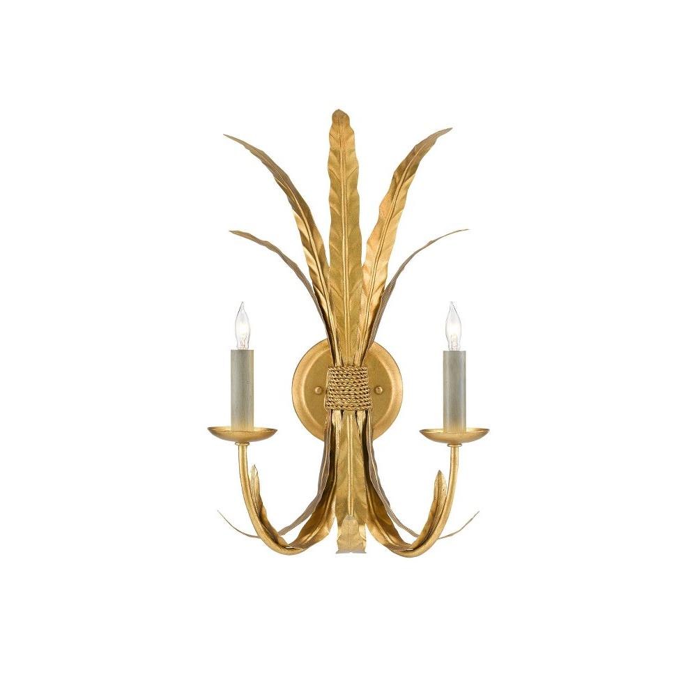 The sheaf of feathers ornamenting the classic shape of the Bette Wall Sconce is a special design note, as is the brilliance of the Grecian gold leaf finish on the wrought iron plumes, arms, bobeches and wall-plate. This lovely gold sconce that is cinched in the middle to make it a beautiful form is in the Bunny Williams Collection, as is the matching Bette Chandelier. The sconce is certified for damp locations.