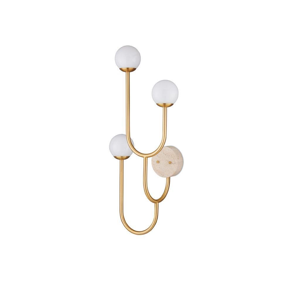 A nostalgic design with milk glass globes that have been popular since Americana was new, the Highsmith Wall Sconce, Left, has an undulant personality. The metal stems that arc up to culminate in three heights on the gold sconce are in a brass finish, as are the brads that fasten the travertine wall-plate in place. The mix of these materials is a refined design detail on this sconce that has a right-facing partner for flanking fireplaces or beds.