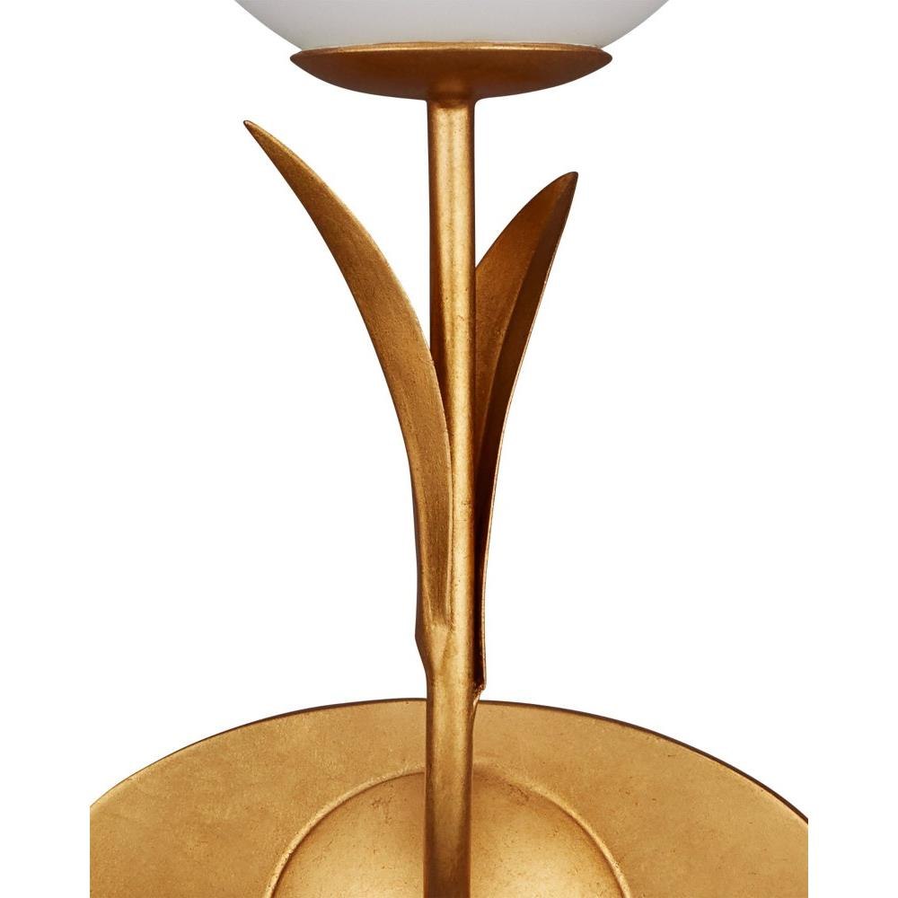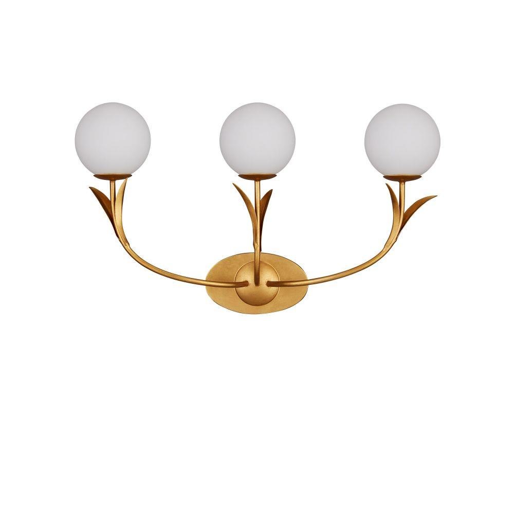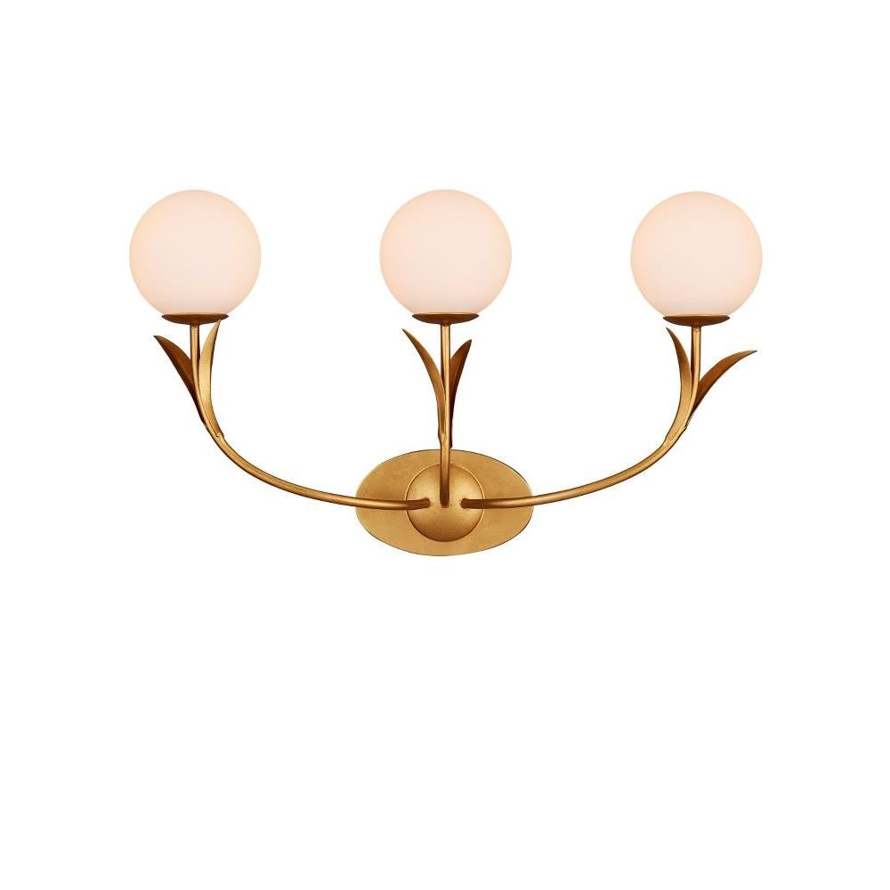 If the Rossville Triple-Light Wall Sconce didn't have such contemporary lines, it could be a throwback to a nostalgic time when globe lights proliferated in ice cream parlors and theaters. But this nature-inspired gold sconce is more modern in its makeup with the thin arcing leaves that flow from it. Made of wrought iron in a contemporary gold leaf finish, the bobeches balance its three white glass globes brilliantly.