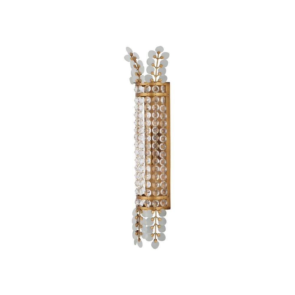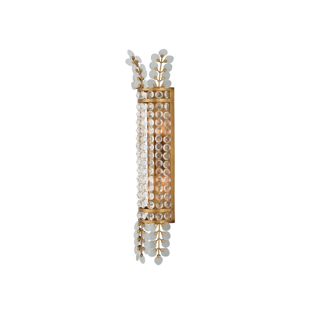 The Bradshaw Wall Sconce, designed by Bunny Williams, is a sophisticated blend of structure and sparkle. Crafted from wrought iron in a warm brass finish, this elegant fixture features a slender columnar form adorned with crystal baguettes at its center. Frosted glass discs extend from both the top and bottom, forming graceful flourishes—the uppermost disc curved like a delicate coronet, lending a regal touch.