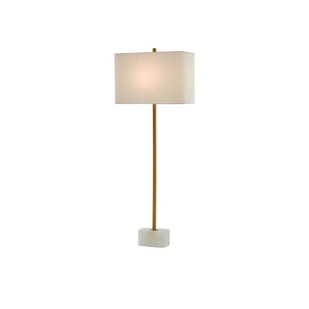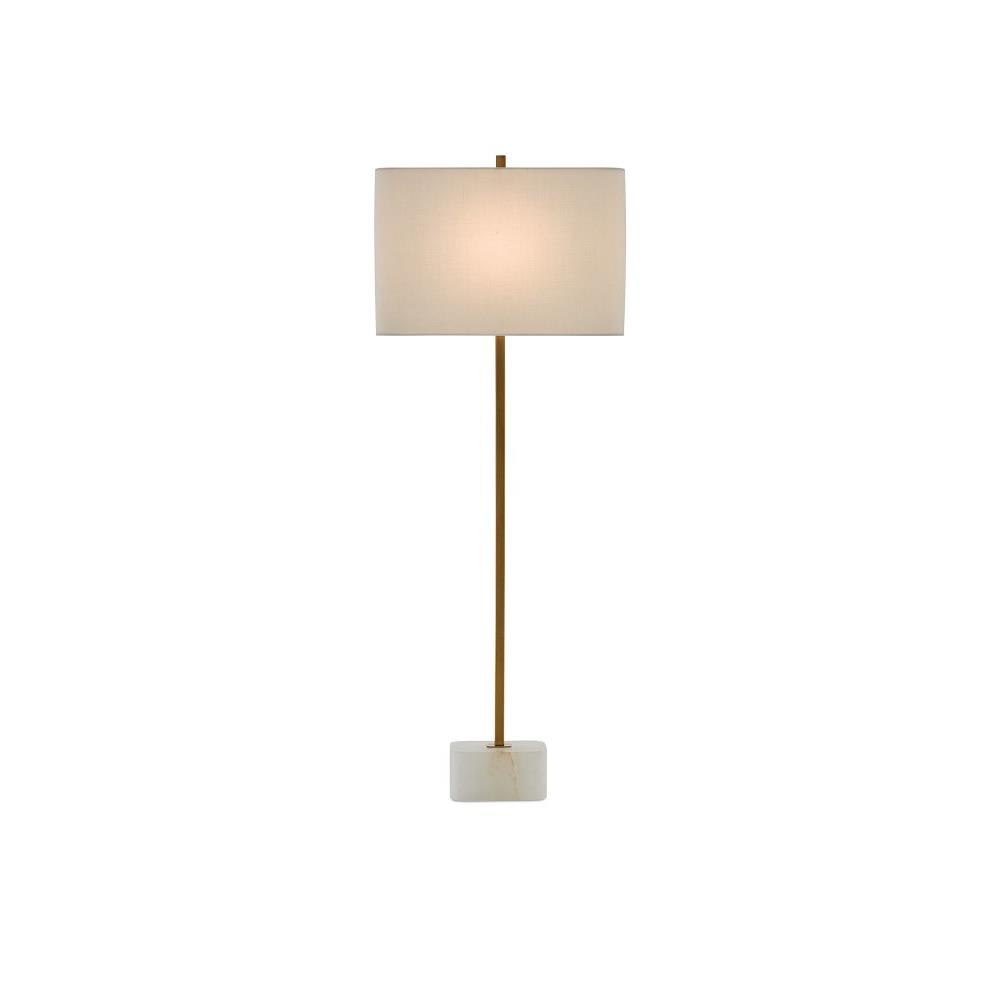 Our Felix Table Lamp is a minimalistic composition with a thin metal spike rising from the natural alabaster base in an antique brass finish. The metal, which includes the matching finial, mimics the tones in the veining on the stone, and the gold lamp is fitted with a rectangular off-white linen shade.