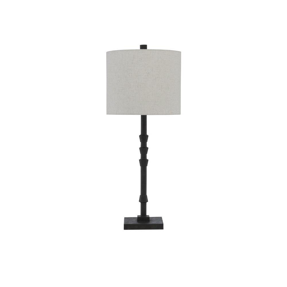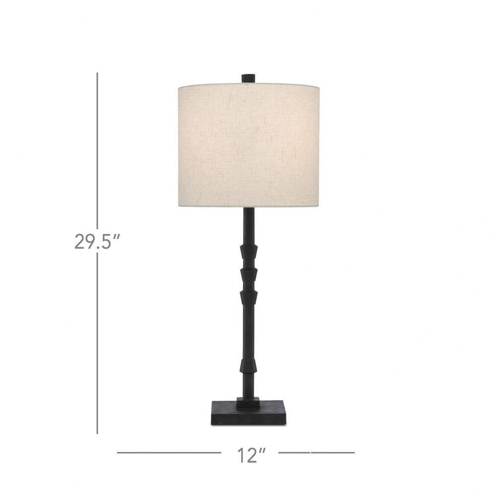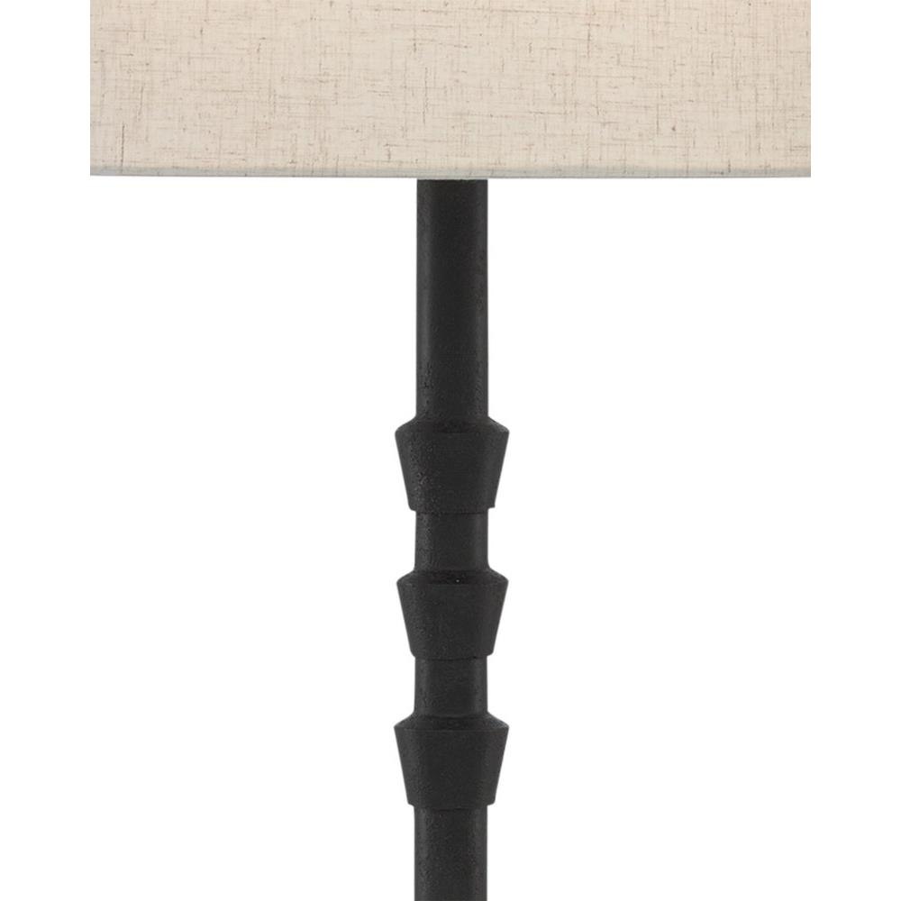 The Lohn Table Lamp has subtle ornamentations on its thin stem: up-turned fluted motifs point toward the beige poplin shade while a down-turned accent points toward the simple stacked base. These elements on the black table lamp are fashioned from cast-iron in a Mole black finish. We also offer the Lohn as a floor lamp.