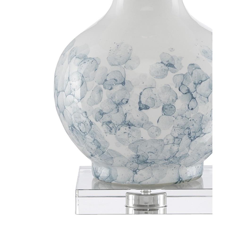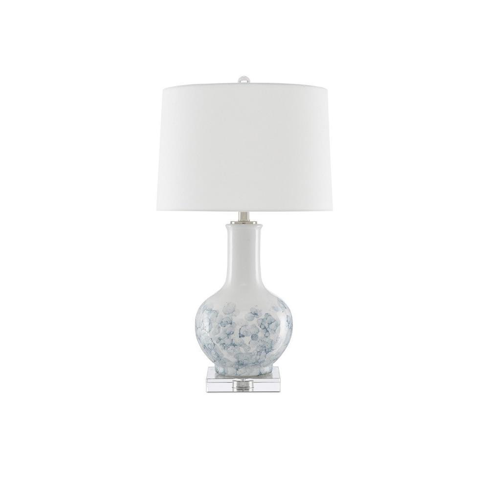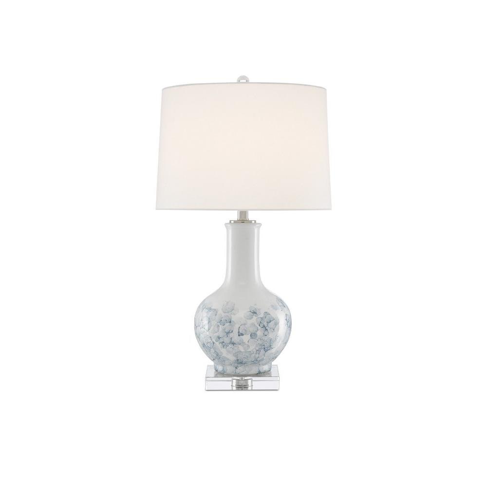 Our Myrtle Table Lamp is made of white and blue ceramic with whispery motifs that read as floral in nature. Sitting atop a clear optic crystal base, the white lamp has a decidedly feminine appeal. Metal hardware in a polished nickel finish and an optic crystal finial fasten the off-white linen drum shade to this table lamp.