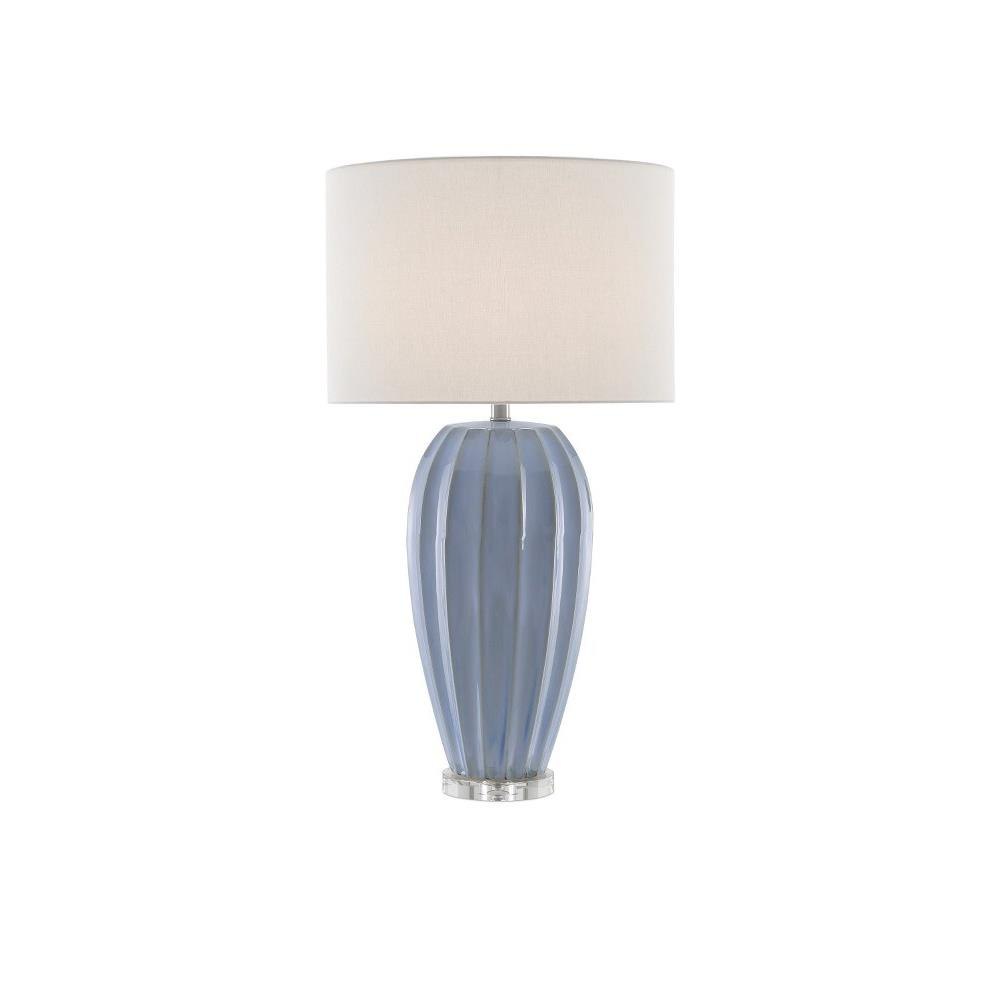 Made of porcelain, the Bluestar Table Lamp has a beautiful ridged surface with distressing at its thickest points. The cornflower blue lamp sits atop a clear optic crystal base and is topped with a white shantung shade. .