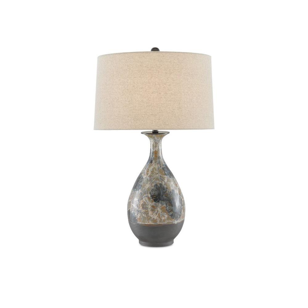 The floral motif on the porcelain body of the Frangipani Table Lamp inspired its name. Shades of cream, tan and blue ornament the elegant brown table lamp, and the pale hues are echoed by the natural linen shade.