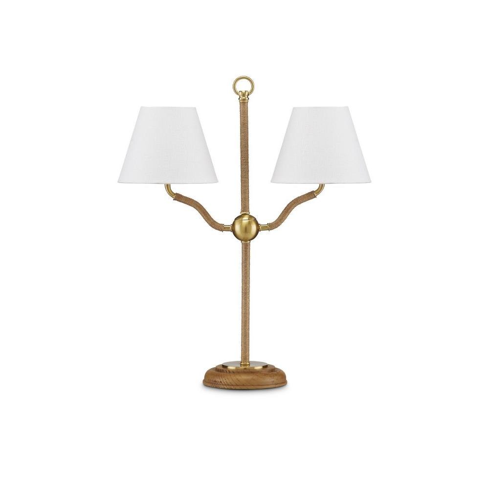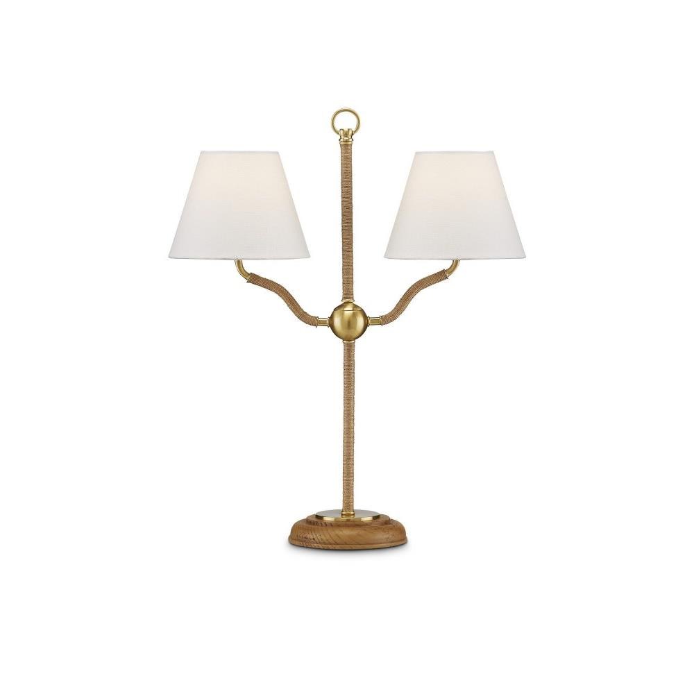 Tom Caldwell created a light profile for the Sirocco Desk Lamp and wrapped all but the main decorative elements in jute rope. These include the ring at its apex, the small globe connecting the forked arms, and the base itself. Made of wood and plated antique brass, the rope desk lamp is fitted with two off-white linen shades. This is a dressy desk lamp that was designed to be a decorative and fucntional accent in a space.