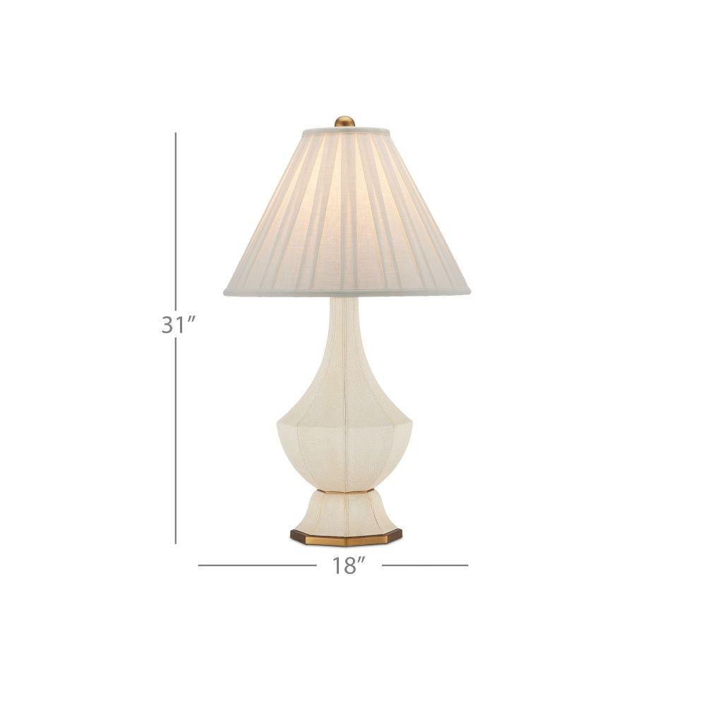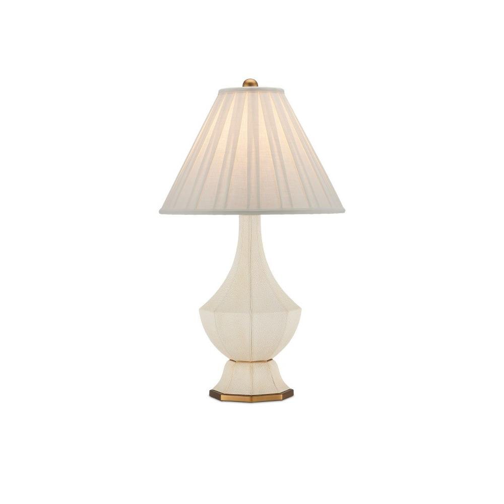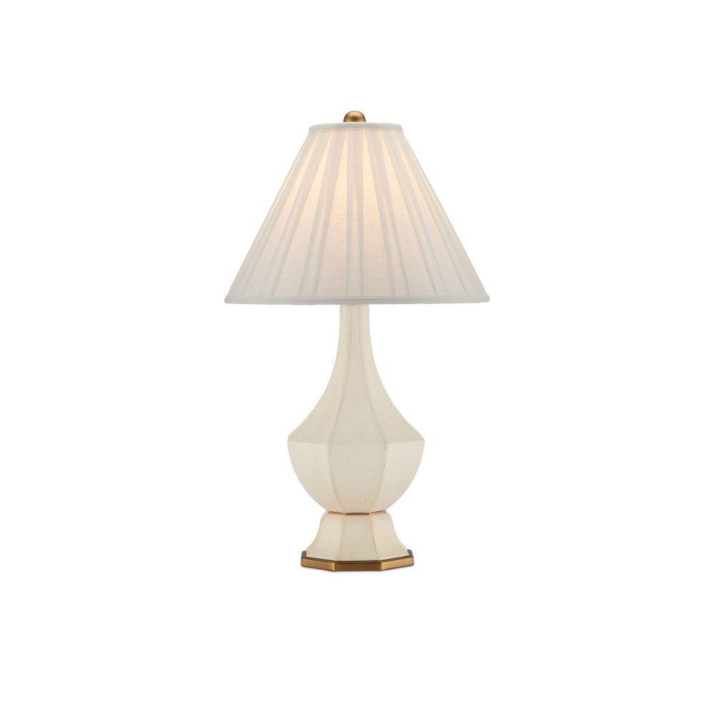 The Musetta Table Lamp is an example of tailored perfection. Panels of faux leather have been expertly sewn and wrapped around the hexagonal shape that makes the lamp's body so appealing. The ivory lamp is cinched by a metal ring as it nears the base, which matches the antique brass finish on the base itself. The box-pleated shade that echoes the scale of the lamp is fastened with a finial that is also in antique brass.