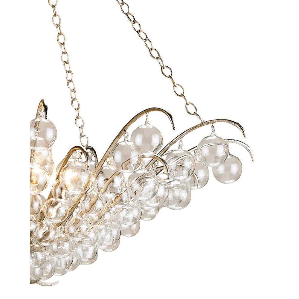 Blown glass balls flowing along the arcing arms of the Quantum Chandelier turn this classic fixture into something special. The delicate wrought iron frame on the silver chandelier in a contemporary silver leaf finish enhances the glow of the shimmering glass baubles.