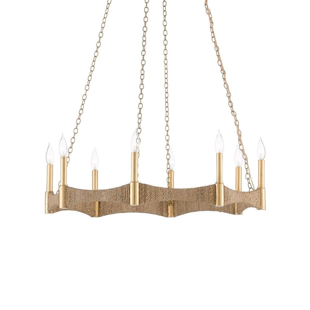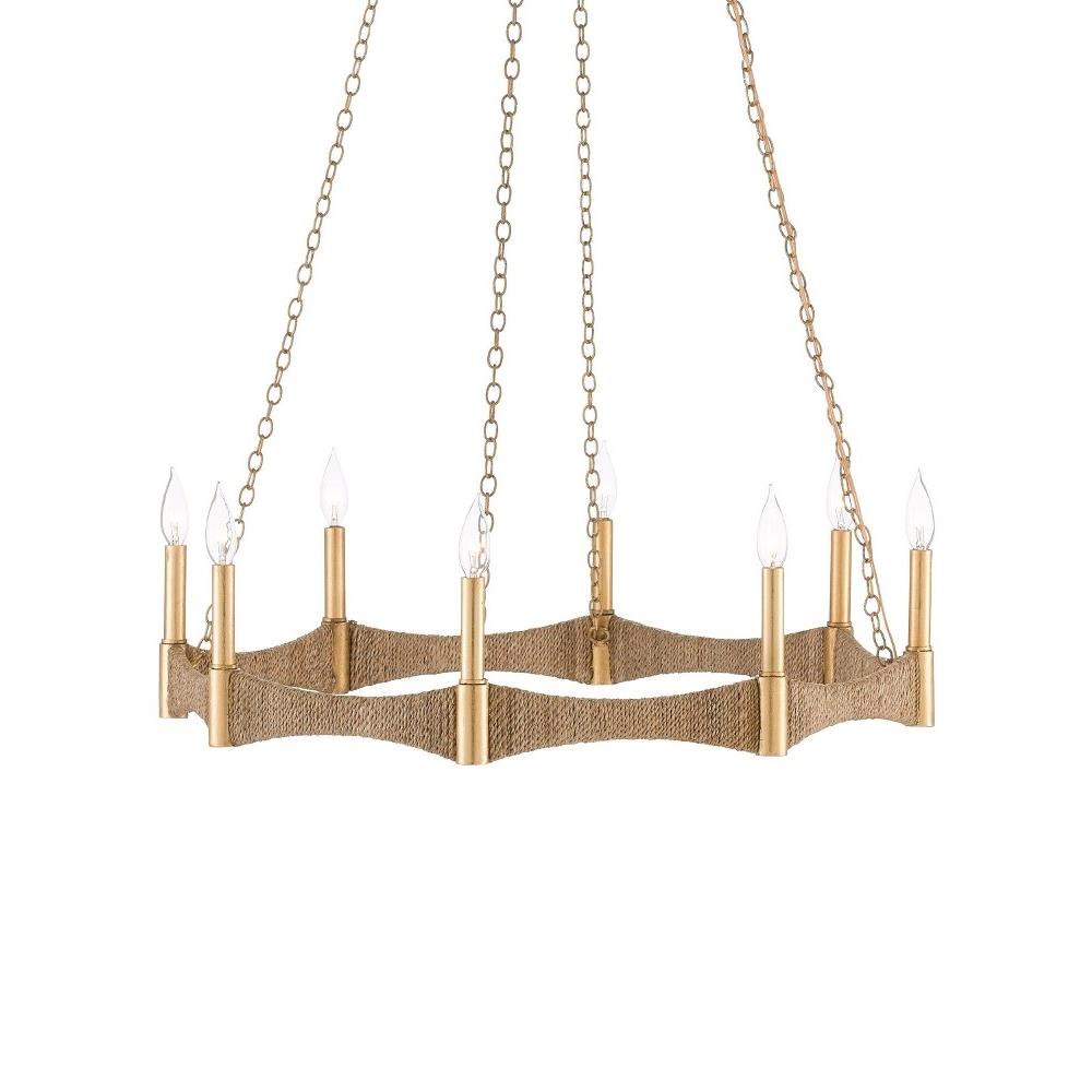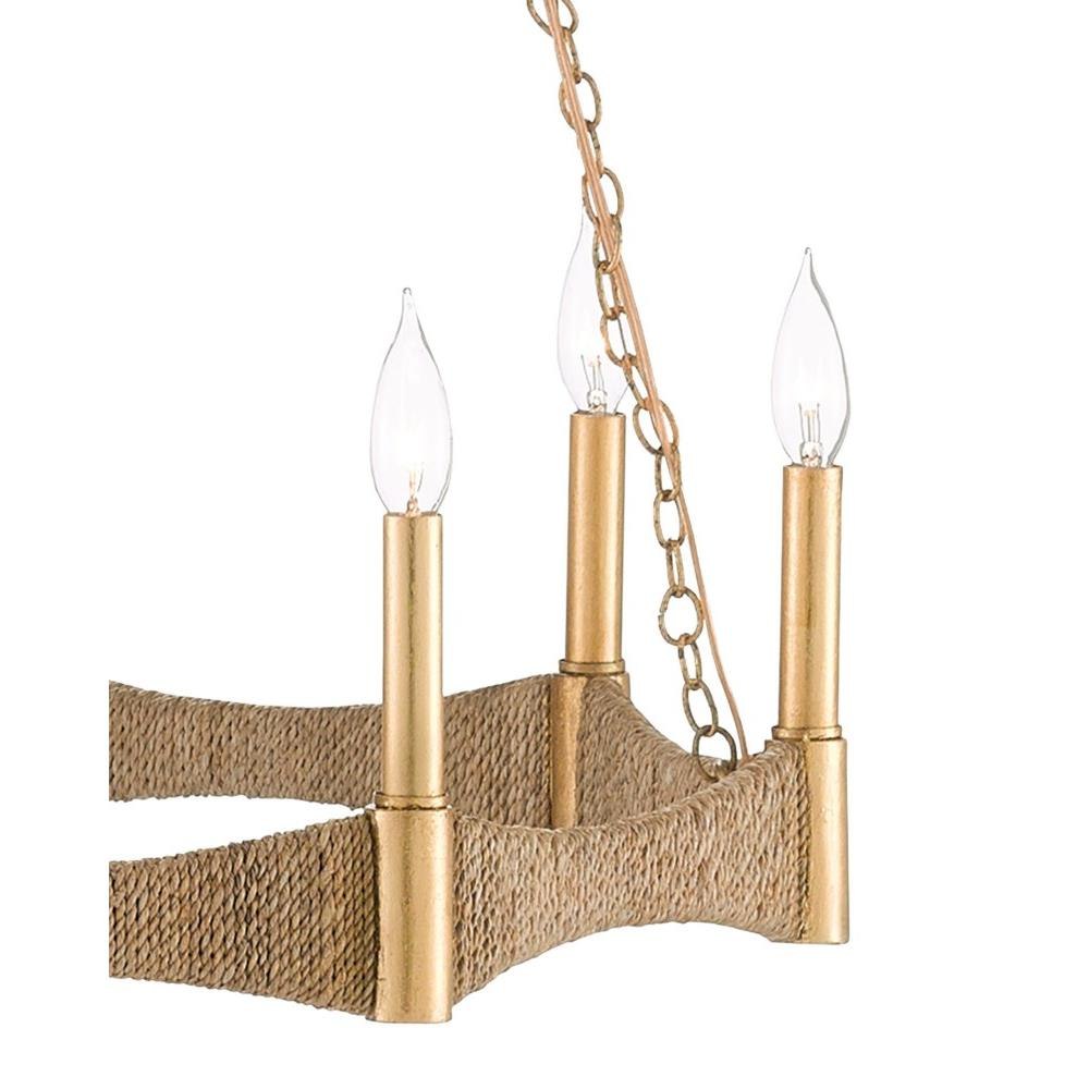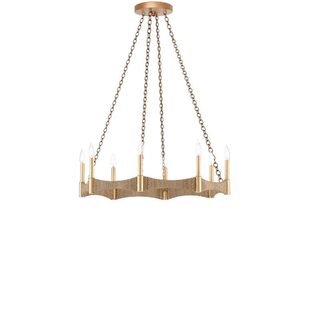 Our Mallorca Chandelier has a wavy profile. The band that connects the eight lights is made of wrought iron wrapped in Abac+í rope. The bulbs that illuminate this rope chandelier are set on luminous rods in a dark contemporary gold finish.