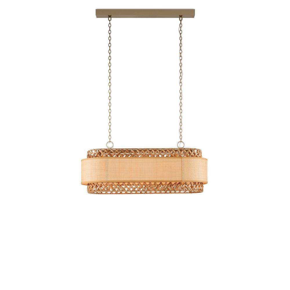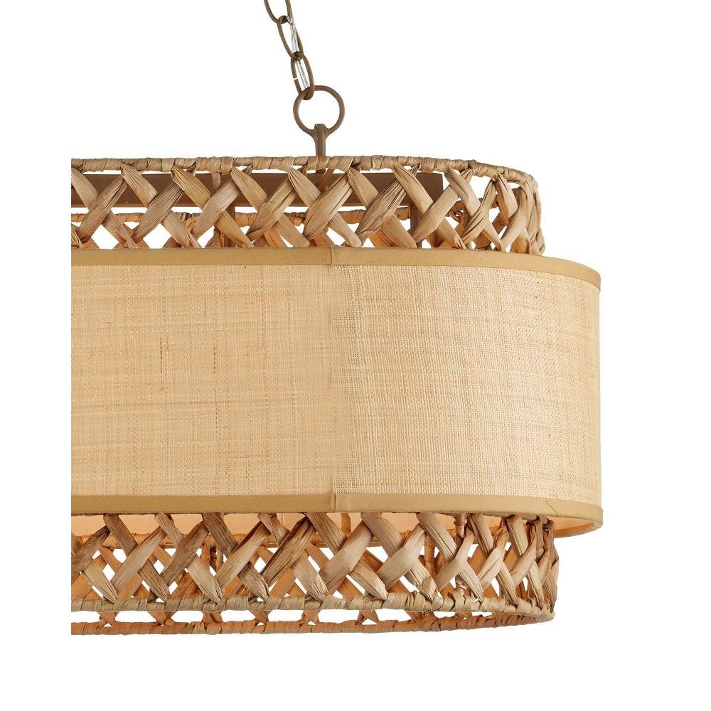 The natural material story continues with the Isola Chandelier with its wrought iron frame in a khaki finish and mix of natural water hyacinth and grasscloth fabric. Designed by Clarence Mallari, the smaller, taller oval that encircles the light has a rough luxe weave of the water hyacinth; while the wider, shorter oval has a tighter weave that juxtaposes the looser crosshatching on this tan chandelier. A design detail of note is that the seams match up when the outer shade transitions from straight to curved.