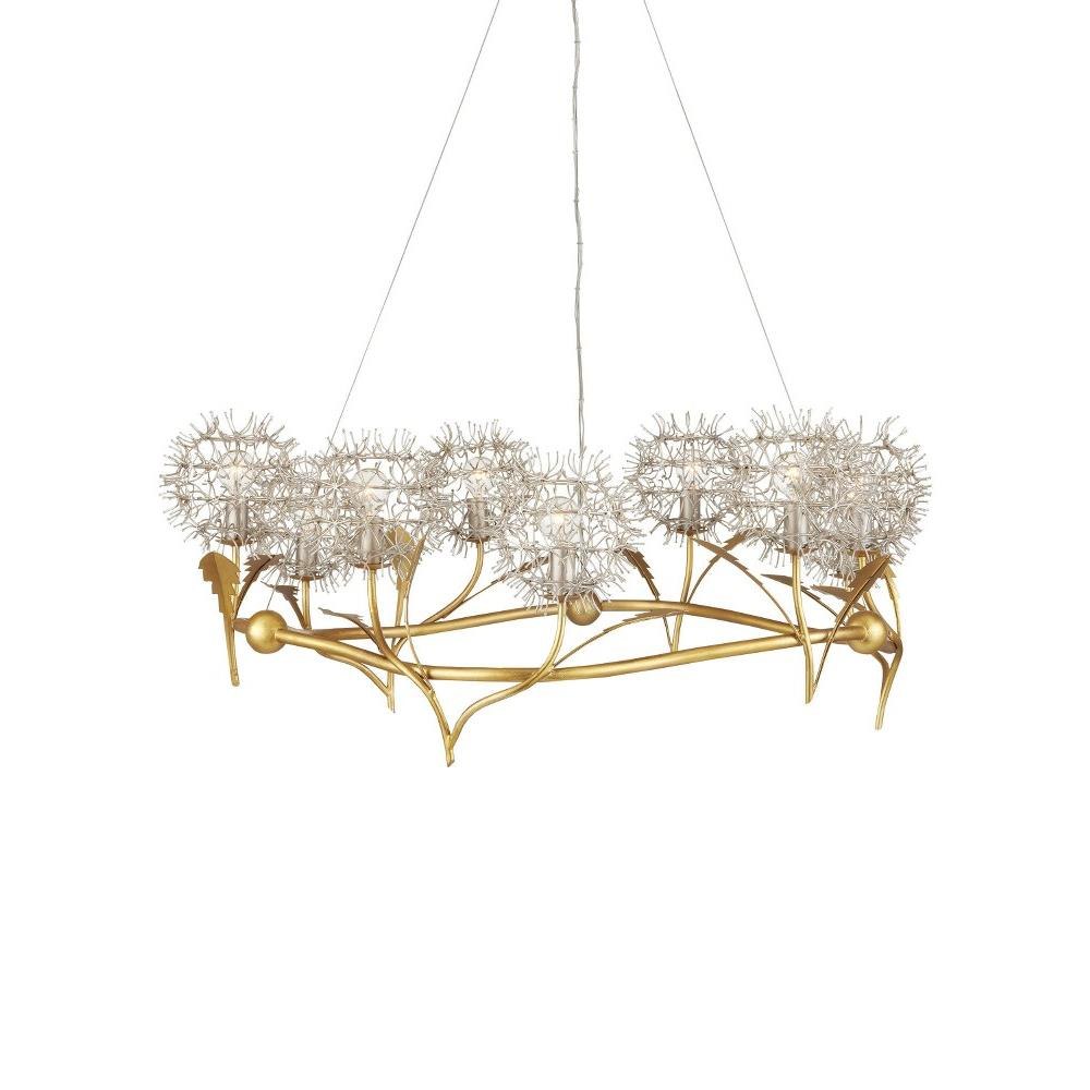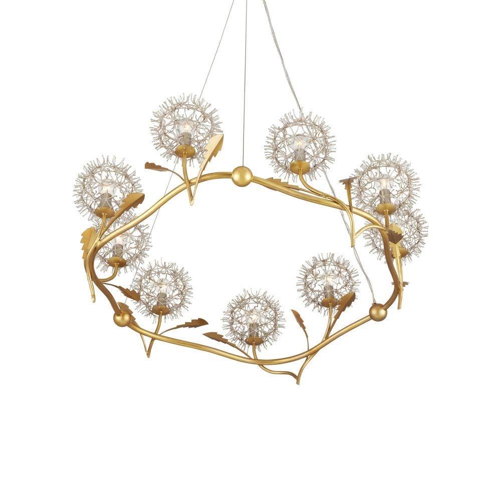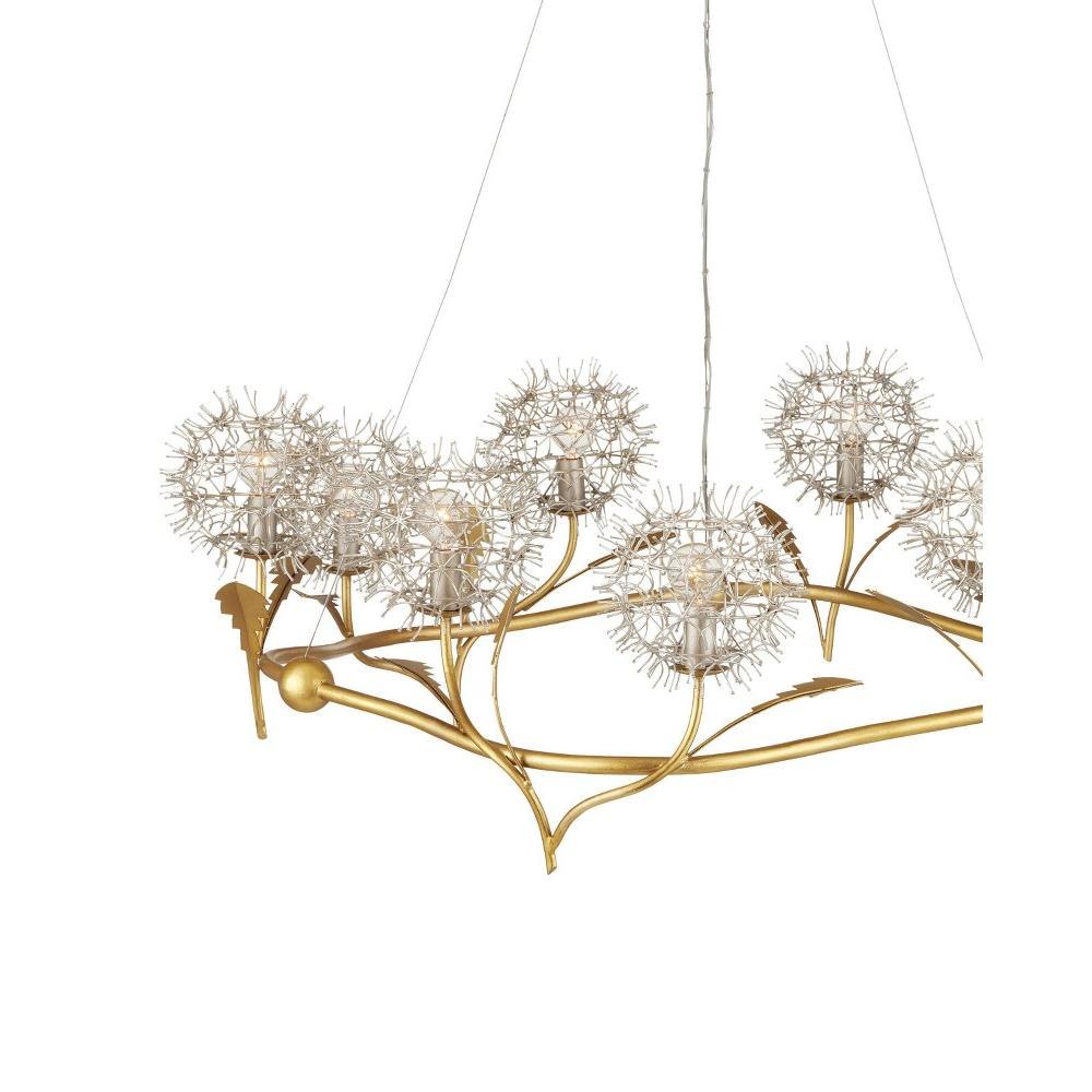 The Dandelion Silver & Gold Chandelier is a masterful composition that celebrates its namesake flower. The puff-balls that surround the bulbs are made of nails that are bent and welded together, a process that is extremely labor intensive. Made of wrought iron, the chandelier's undulant rings, orb accents, and leaves are in a contemporary gold leaf finish, while the floral elements are in a mix of contemporary silver leaf and contemporary silver finishes. This special piece expressively celebrates nature.