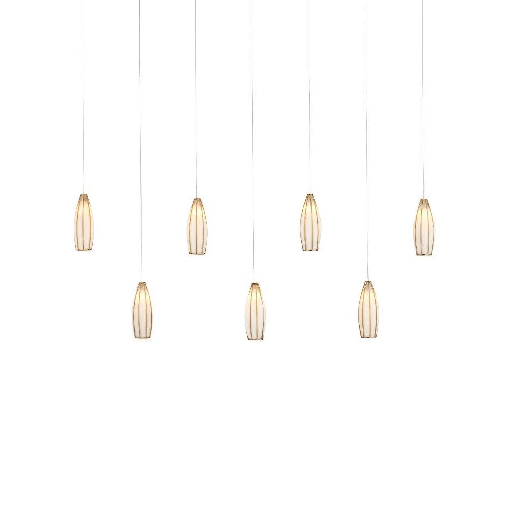 The Parish 7-Light Rectangular Multi-Drop Pendant has slender tear-drop-shaped shades made of white glass poured into a metal cage in an antique brass finish when it was still molten. A remarkable result of this process is that it creates tiny pinholes of light that escape through micro-bubbles that formed in the glass, making the Parish effervesce like an upside-down goblet of champagne.