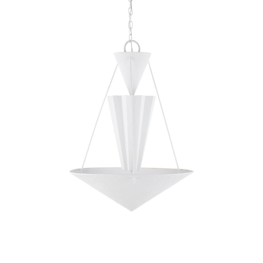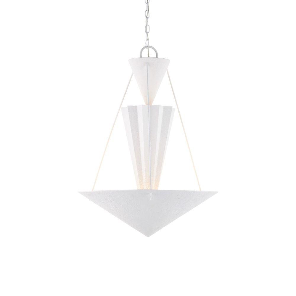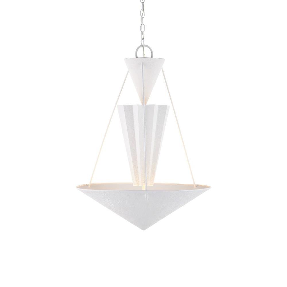 Playing with geometrical shapes that create tiers of up-light, the Empyrean Chandelier was designed with clean lines, making it as contemporary as designs come. The fluted shape of the middle shade is a design detail that brings added interest to the profile of this white chandelier. The wrought iron fixture is covered in a yeso blanco finish that creates a stippled effect to add a subtle tone-on-tone texture to the piece. Adjustable from 38.5" to 106.5" with use of included chain/rod kit/cable. If your space calls for a longer drop, additional chain/rods/cable is available for purchase.