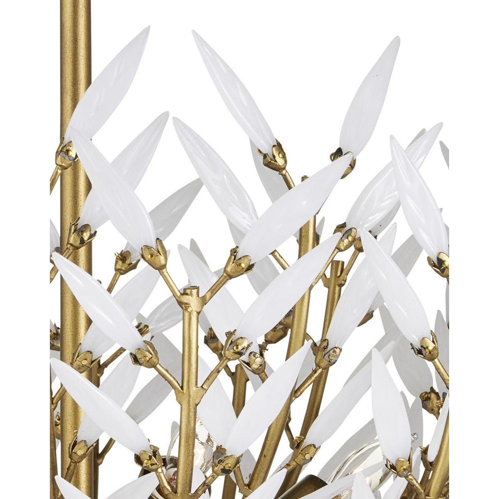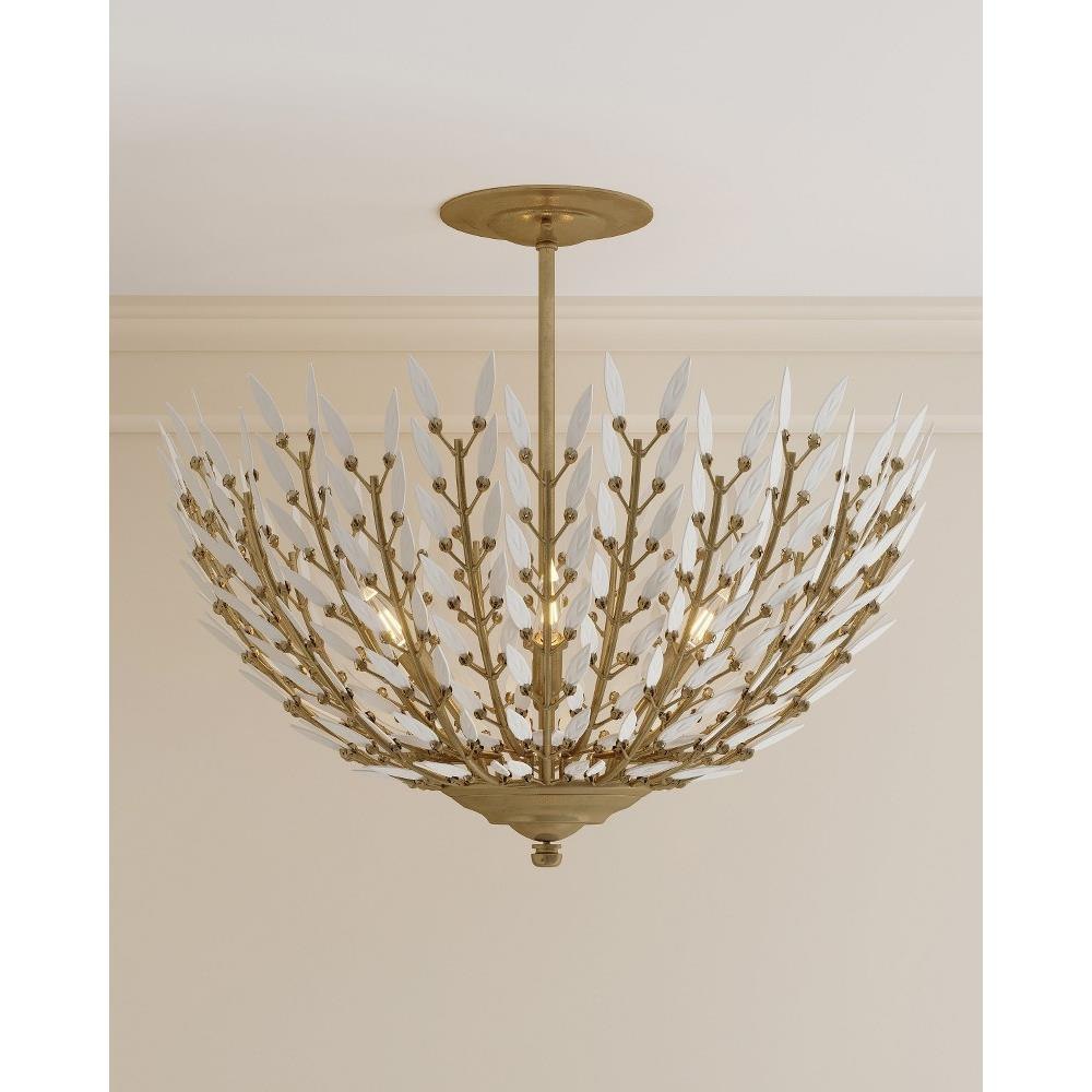 Undertaking the challenge of creating a clean-lined version of a vintage design, the Magnum Opus Semi-Flush Mount features rows of more than 300 glass leaves attached to the metal stems that effervesce when light strikes them to create a stunning sculptural fixture. The white glass also beautifully contrasts the metal in a brass finish, the cool/warm contrast bringing the gold semi-flush a heightened level of interest. The beautiful white glass leaves also surround the bulbs on this fixture to infuse a space with a lovely glow. Adjustable from 25.5" to 93.5" with use of included chain/rod kit/cable. If your space calls for a longer drop, additional chain/rods/cable is available for purchase.