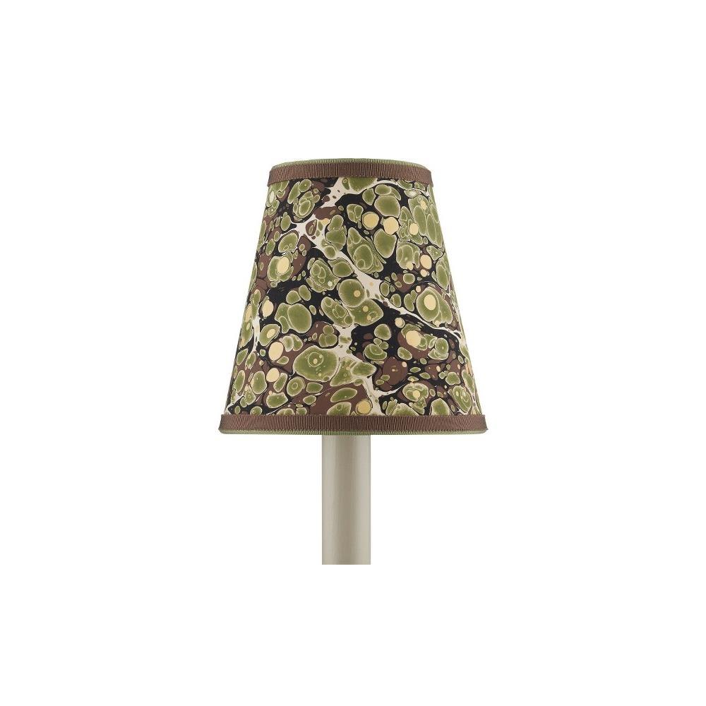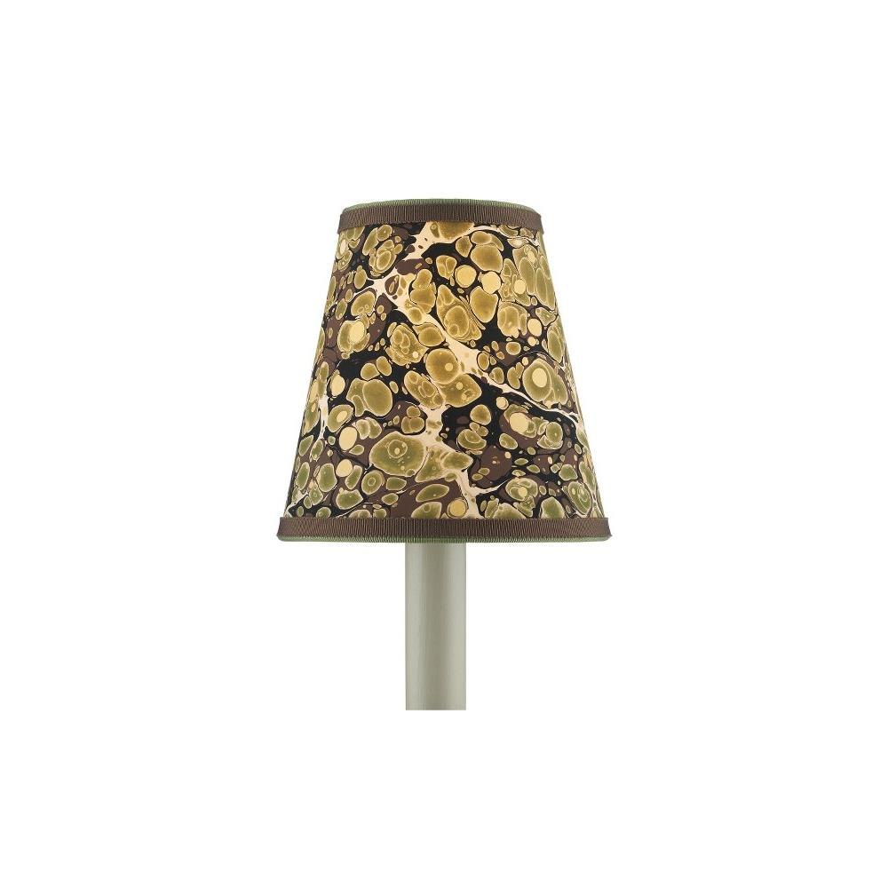 Petite shades are an easy way to bring added style to a space while also introducing color and texture, particularly when they are made from artisanal marbleized paper and ornamented with two layers of grosgrain ribbon in different hues. The saturation of the colors on the handmade tapered and cylindrical shades for chandeliers and wall sconces is achieved by a New England atelier. Patterns will vary because they are created during a very organic process that makes any surface treated to marbleizing so special. There are both vivid and pastel patterns in this collection, as you can see from this green, brown, gold version of the tapered shade. Top Diameter: 3" Bottom Diameter: 5" Height: 5"