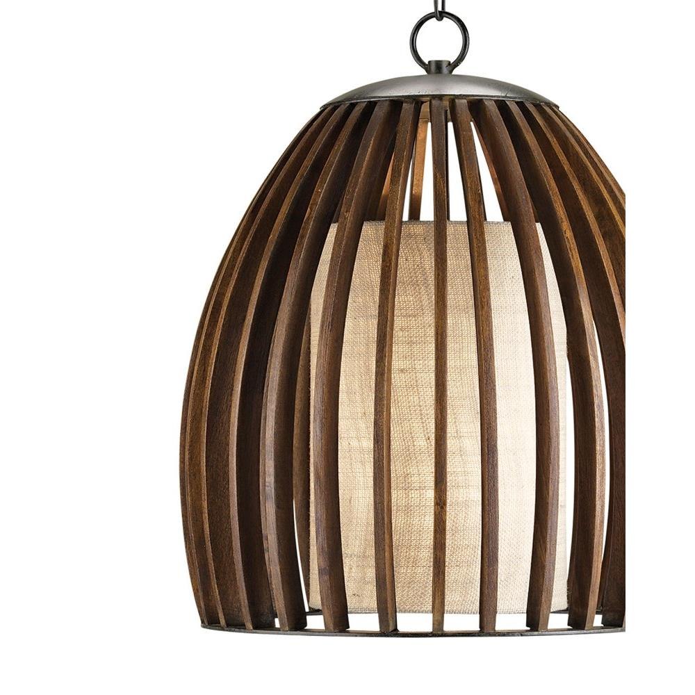 The dome-shaped Carling Pendant flaunts a mid-century modern aesthetic. The cage of its body is made of softly curved vertical slats in a gleaming polished fruitwood finish. The wood pendant envelopes a rustic but stylish putty burlap diffuser that softens the fixture's glow.