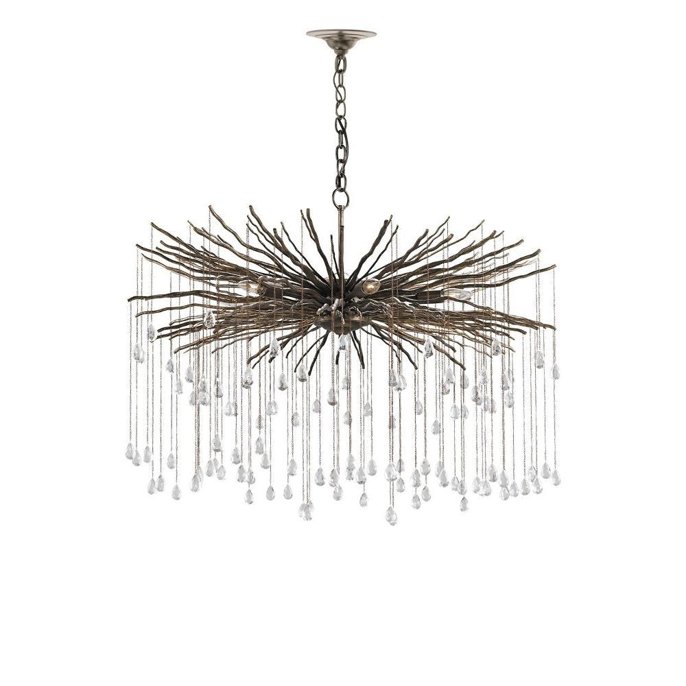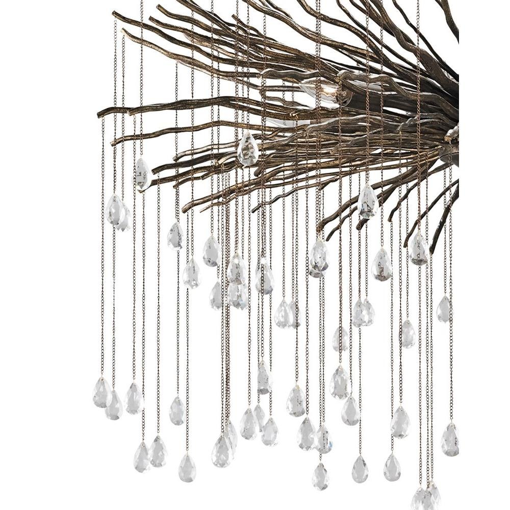 The Fen Large Chandelier is made of wrought iron limbs that stretch outward like gnarled branches. Each one supports a delicate chain adorned with a single crystal. The brutalist design of this bronze chandelier is heightened by the Cupertino finish. The Fen also comes in a smaller version.
