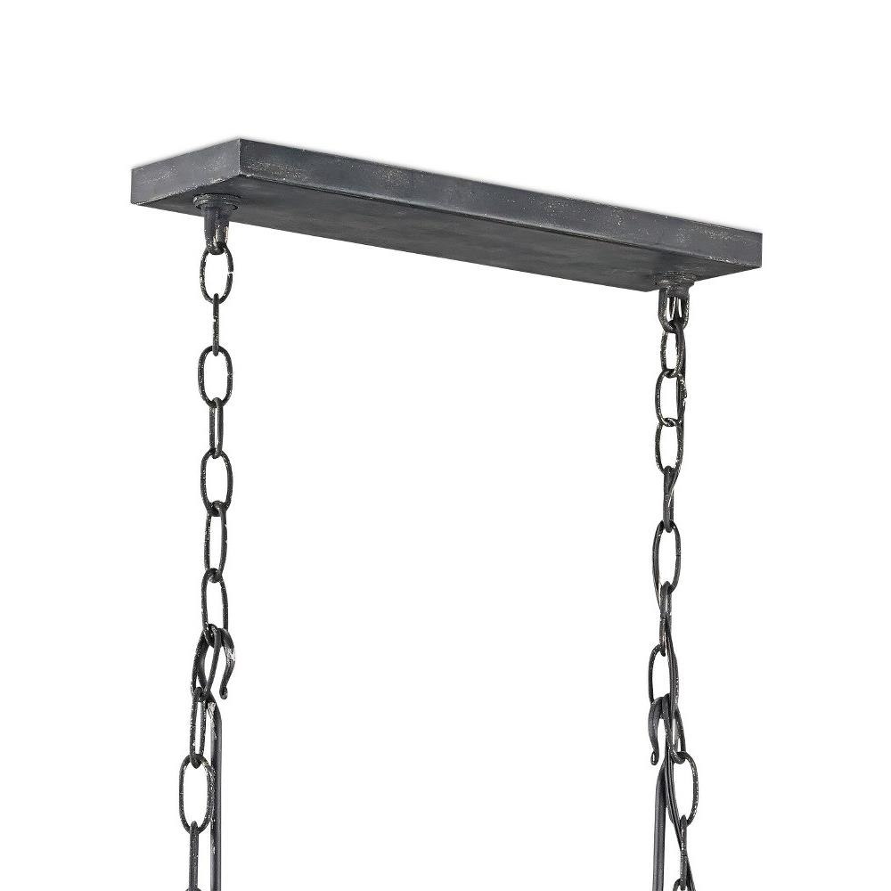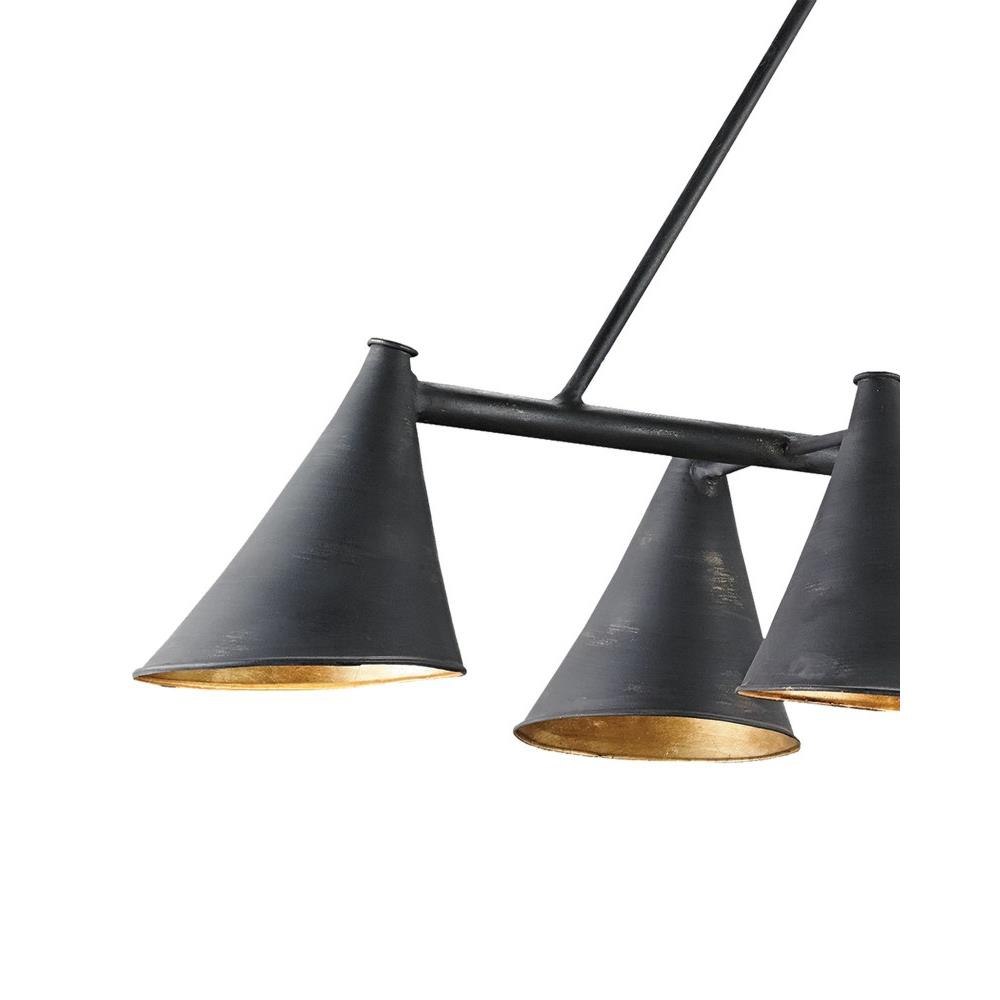 Mid-century modern has a rustic edge in the design of the Culpepper Rectangular Chandelier. The wrought iron shades of this black chandelier have interiors in a contemporary gold leaf finish, while the linear frame and exterior of the shades are finished in a distressed French black.