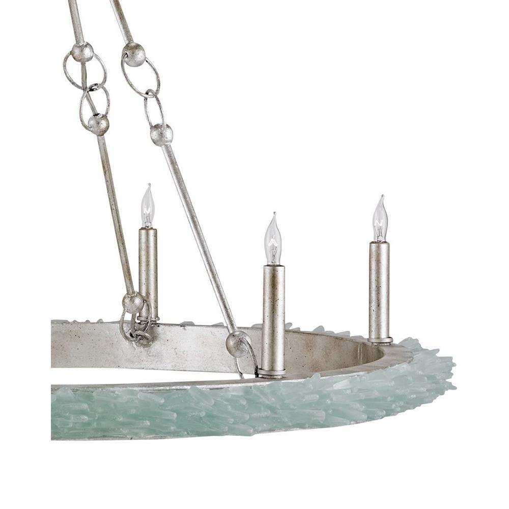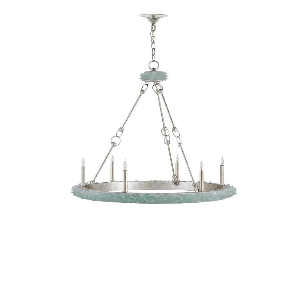 The Tidewater Chandelier, ringed in natural sea glass, is a nod to nautical luxury. Where the silver chandelier isn't covered in pale aqua glass, it has a gleaming silver Granello finish. Adding to the luxe feel, the arms that attach the upper ring to the lower one have sophisticated interlocking accents.