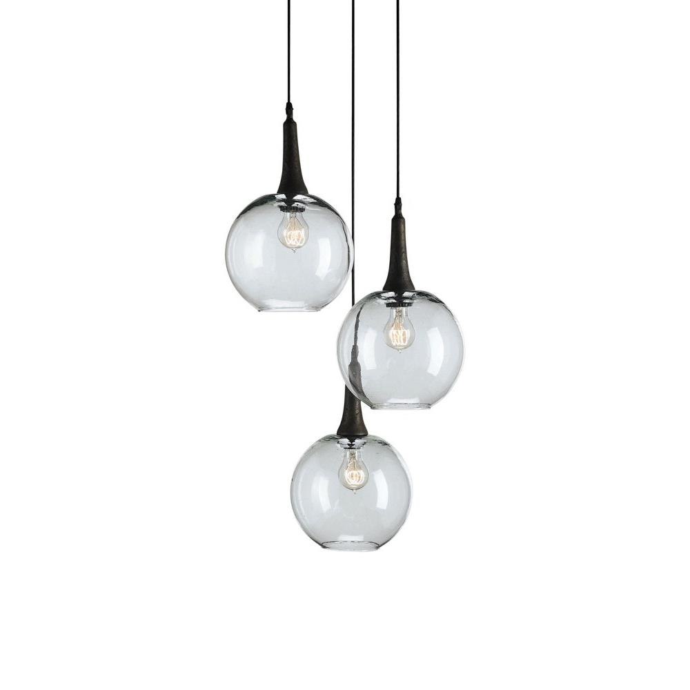 Design notes that make the Beckett Trio Pendant special are how simply the voluptuous glass spheres dangle at differing heights, the Emery rust finish on the wrought iron that serves as a contrast, and the slightly gray tone of the glass that is tonally perfect melded with back. We also offer the Beckett in a one-globe pendant.