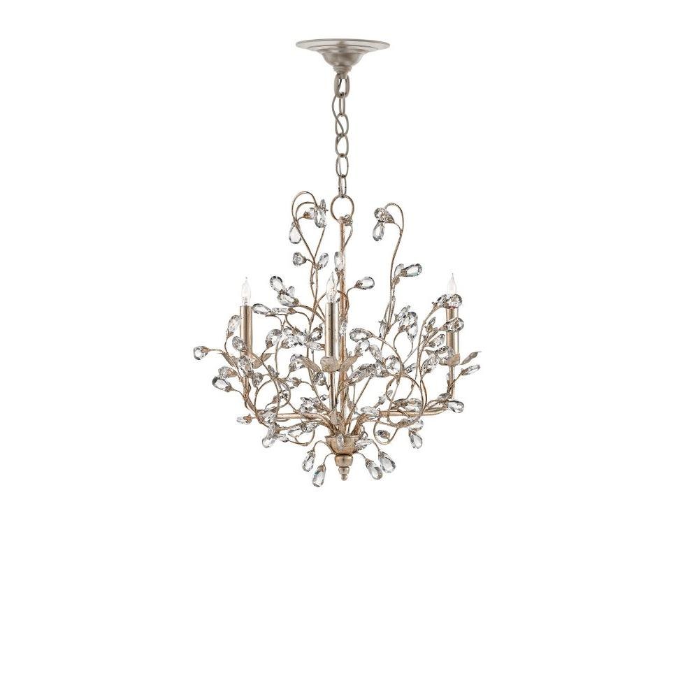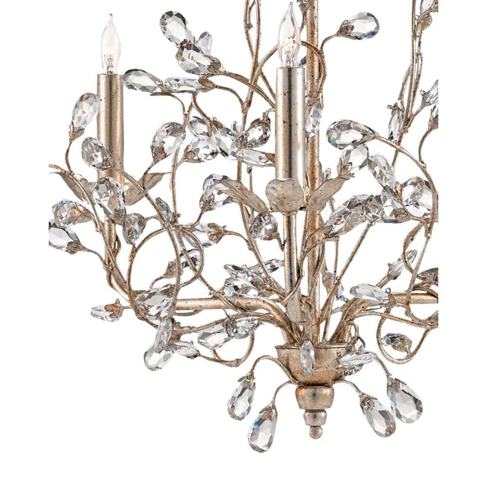 The Crystal Bud Cupertino Small Chandelier has delicate faceted crystals unfurling from vines that flow along its frame. The rust-colored metal in a Cupertino finish serves as a warm contrast to the luminous glass, the interplay making the profile of this crystal chandelier complex. This is one of the fixtures in the varied Crystal Bud family of lights.