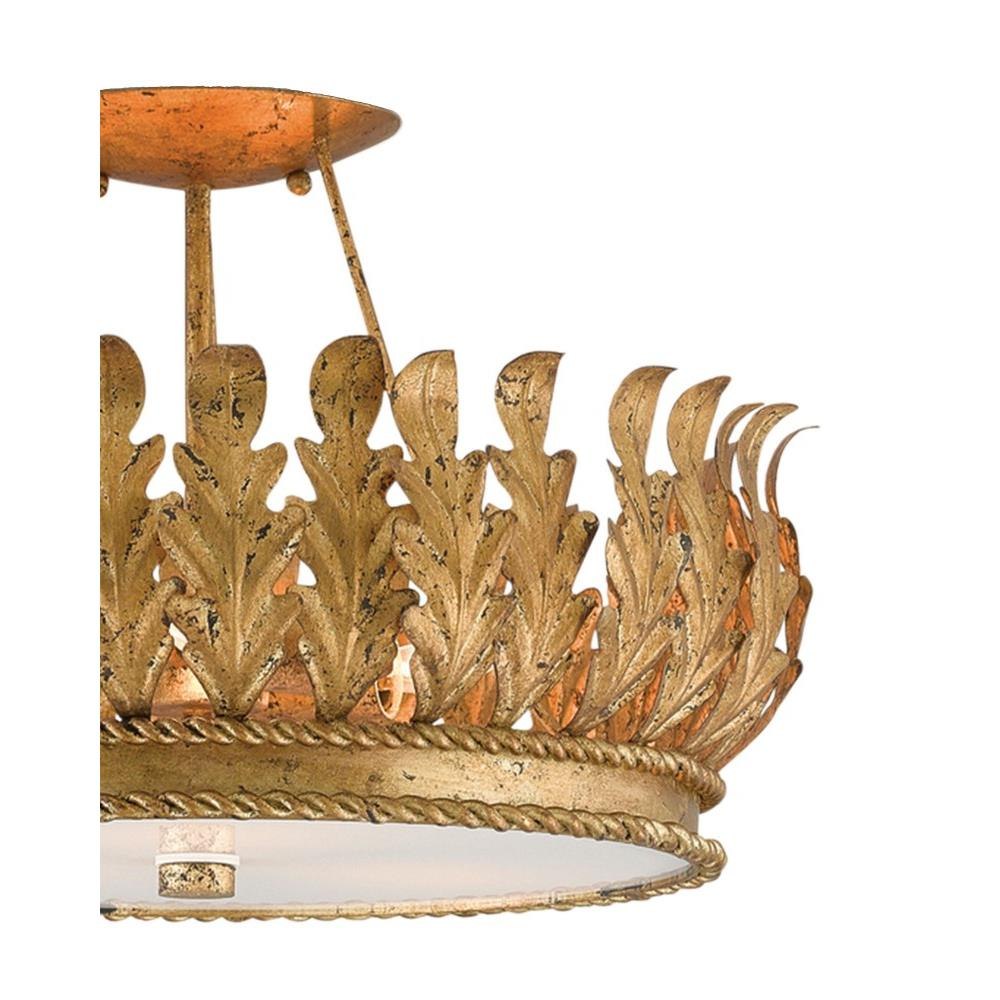 The acanthus leaves rising up from the rope-ringed band of the Biddulph Semi-Flush are made of wrought iron in a gold leaf finish. These match the mount securing this gold ceiling light to the white acrylic shade. This light is one of our introductions in the Bunny Williams Collection.