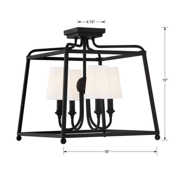 This lantern-inspired flush mount brings a modern flair to your space with its striking geometric design. The shapely steel frame, precisely balanced arms, and tailored white shades create a transitional feel. With four candelabra bulbs (not included) up to 60W, this fixture provides ample ambient lighting to your living room, entryway, or hallway. We love how the matte black finish gives it an industrial vibe that complements a variety of colors and aesthetics. Plus, it's dimmable, so you can set the right lighting mood throughout the day.