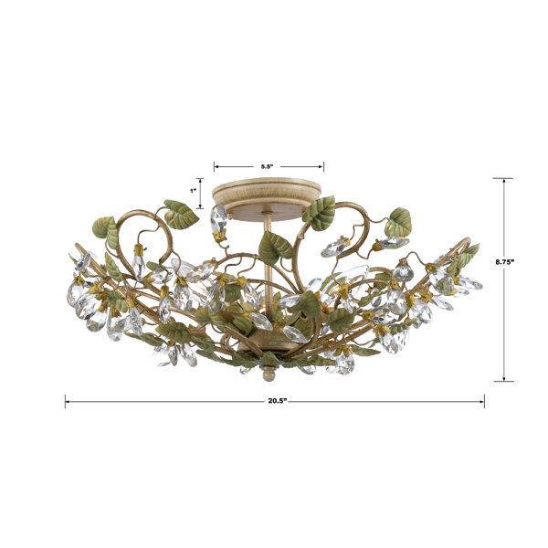 Glam meets garden in this striking semi-flush mount, designed to make a statement in your entryway or breakfast nook. The frame is crafted from wrought iron, showcasing a twisting branch design with a champagne green tea finish. Five lights are nestled within, accentuated by carved leaf details and sparkling crystal jewels that catch the eye. Measuring 20.5'' in diameter, this damp-rated fixture adds an ambient glow to your space. Don't forget to pick up five candle-shaped bulbs up to 60W to complete the look (sold separately).