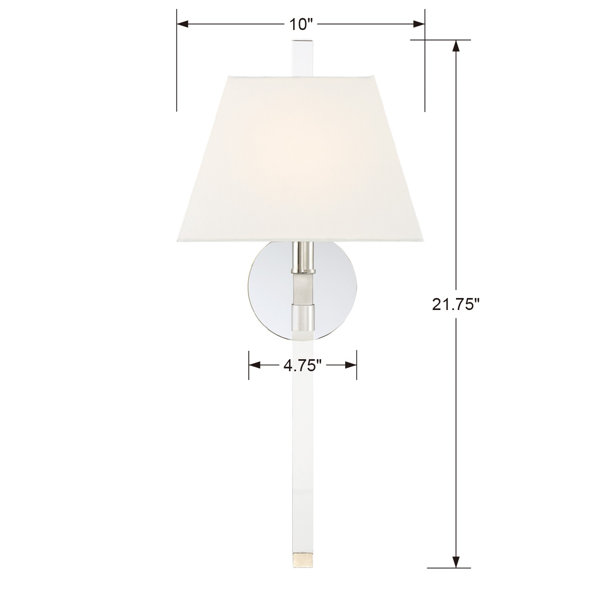 Versatile enough to add to just about any space, this armed sconce adds a little sparkle and shine to your wall. This hardwired fixture is made from metal and features a clear rod body that extends from a circular backplate in the finish of your choice. Inside the tapered white fabric shade, this sconce accommodates a single 60W incandescent bulb (sold separately). For added versatility, this sconce is safe to use in damp locations and compatible with dimmer switches.